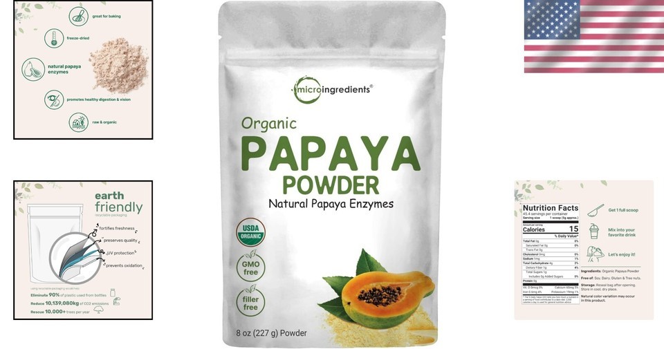 USDA Organic Papaya Powder, 8 ounce supply, non-GMO and vegan-friendly freeze-dried papaya source.