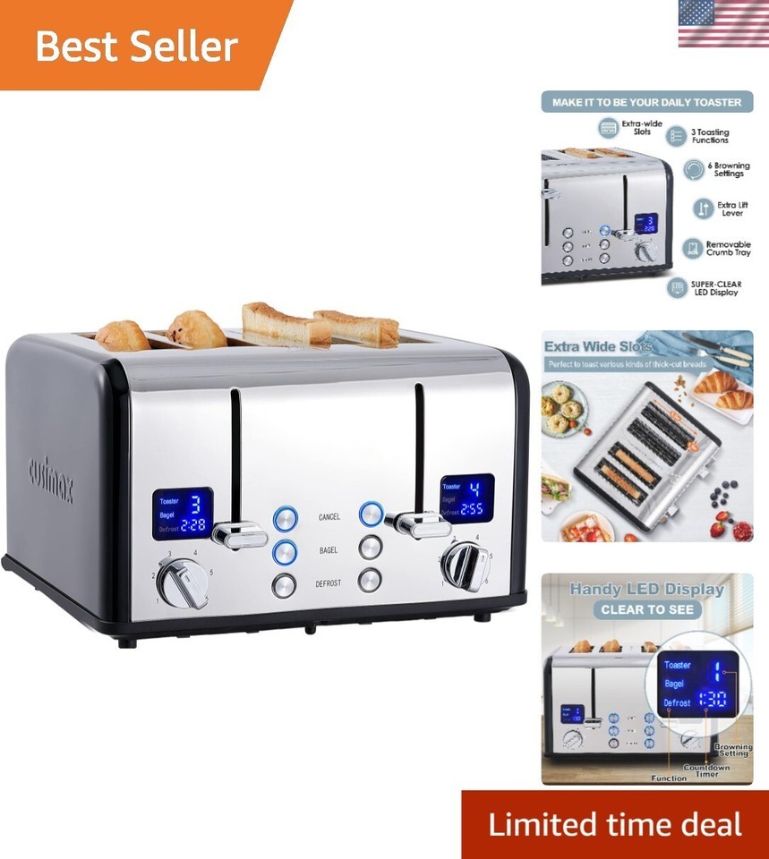 Elevate your breakfast routine with our Multi-Function 4 Slice Toaster, designed to toast a variety of bread types with different browning shades simultaneously. The smart features such as the LED Display, multiple toasting functions, and stainless steel housing make it a great value for the price. With easy cleaning and convenient toasting options, this toaster is a must-have for every kitchen.