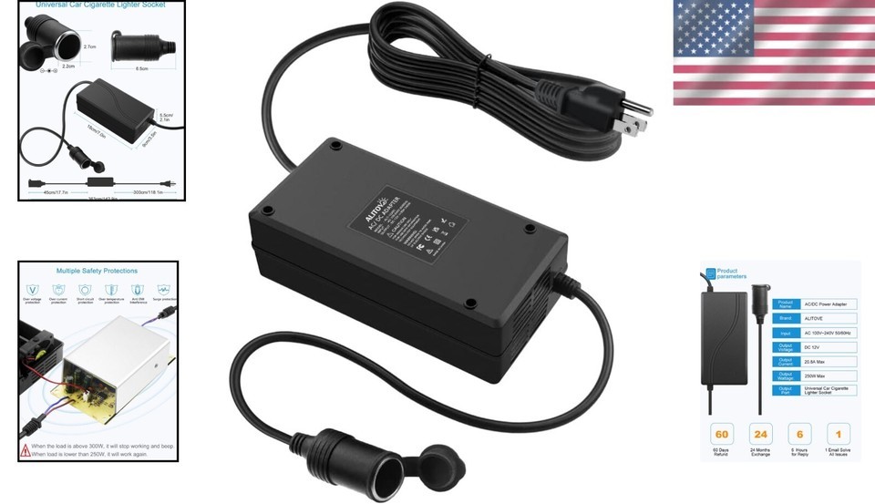 12V Power Supply Adapter - 250W Converter for Car Refrigerator Tire Inflator