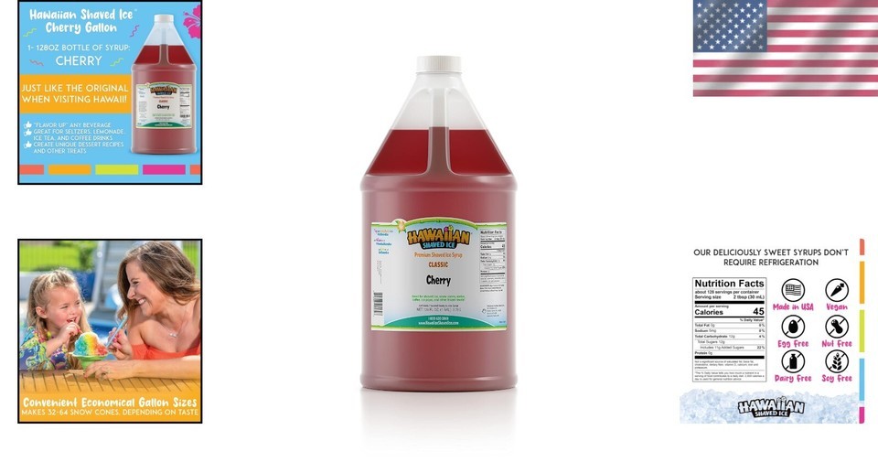 Enjoy the delightful flavor of cherry fruit juice without any chemical or artificial aftertaste. Our syrup revisits the sweetness of slushy snow cones from your cherished childhood memories at carnivals and fairs. Bottled with care at our North Carolina facility, it maintains a high standard of quality.