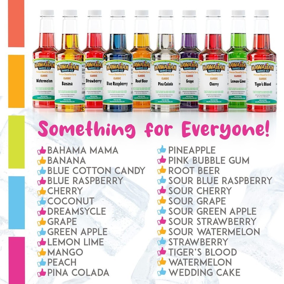 Our cherry syrup isn't just a standalone star; it's part of a vibrant flavor lineup including Grape, Blue Raspberry, Strawberry, Lemon-Lime, classic Banana, Carnival favorites Tiger's Blood, Root Beer, Watermelon, Piña Colada, and many more?including inventive flavors such as Blue Cotton Candy and wedding cake!
