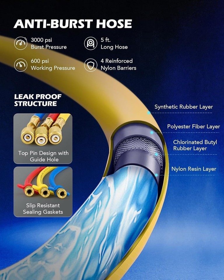 This versatile gauge set is compatible with R134a, R12, R22, and R502 refrigerants, tailored for both DIY enthusiasts and professional HVAC technicians. Perfect for measuring system pressure, evacuating and refilling coolant, and more, this kit ensures you have everything you need for successful maintenance.