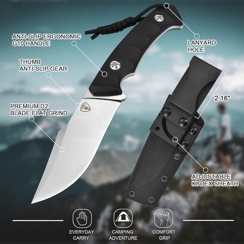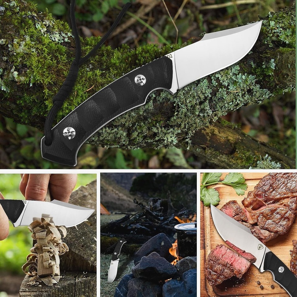 Embrace the great outdoors with confidence and style. Our fixed blade knife blends quality craftsmanship with practical design. The full tang construction provides superior strength and balance, enabling you to handle challenging tasks with ease. The rugged D2 steel, paired with a thoughtfully designed G10 handle, ensures that every cut is effortless.
