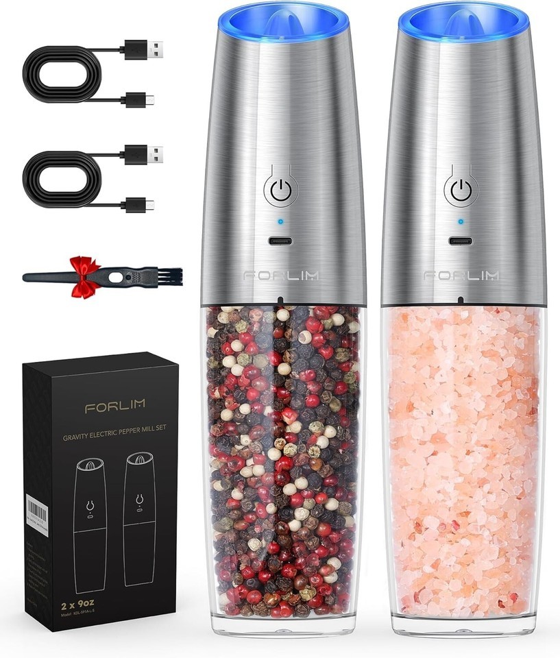Premium Stainless Steel Salt and Pepper Mill Set - USB Rechargeable LED Light