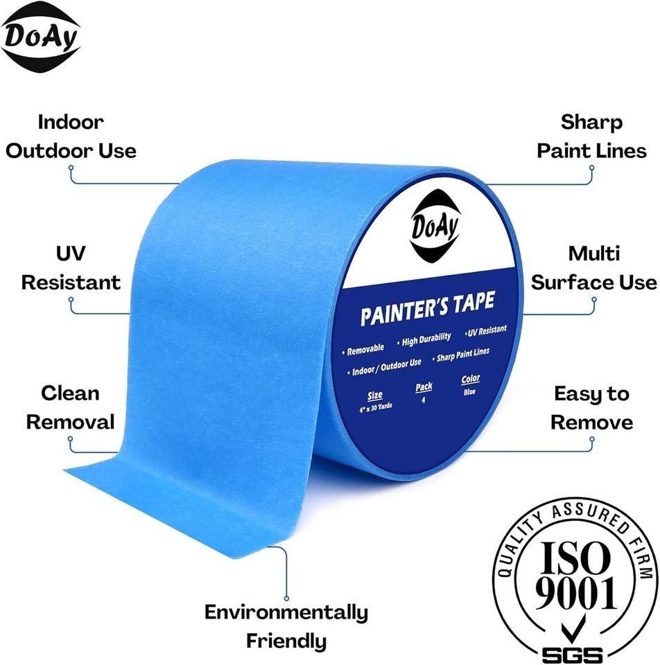4 Rolls of Blue Painters Masking Tape - No Residue, Ideal for Professionals