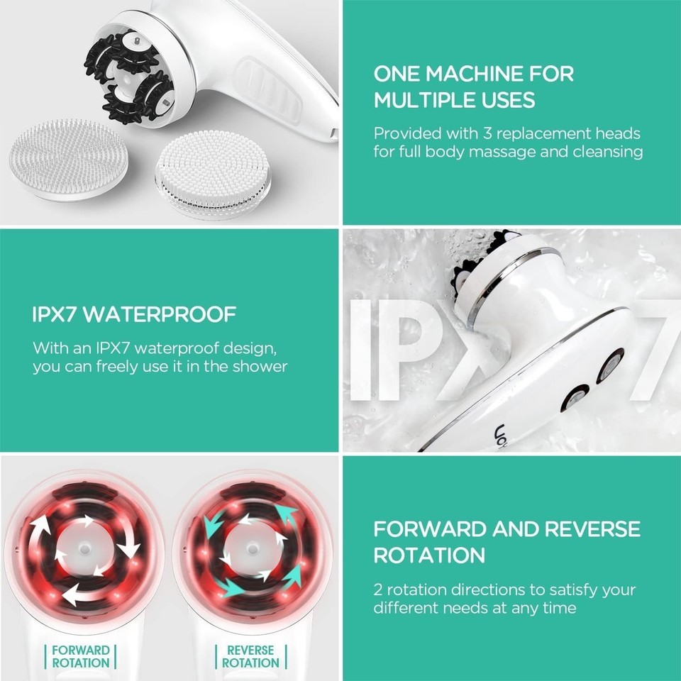 Features: Cordless,Waterproof,Adjustable Speed Levels,Ergonomic Handle,Facial Cleansing Brush Head,Body Cleansing Brush Head