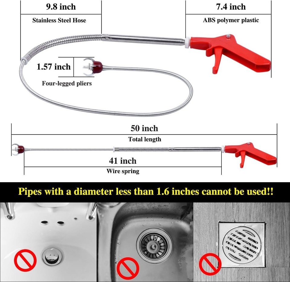 Features: None,4-claw grabber,Telescoping rod,Flexible hose,Stainless steel construction,Anti-scratch measure,Maximum of 50.4 inches