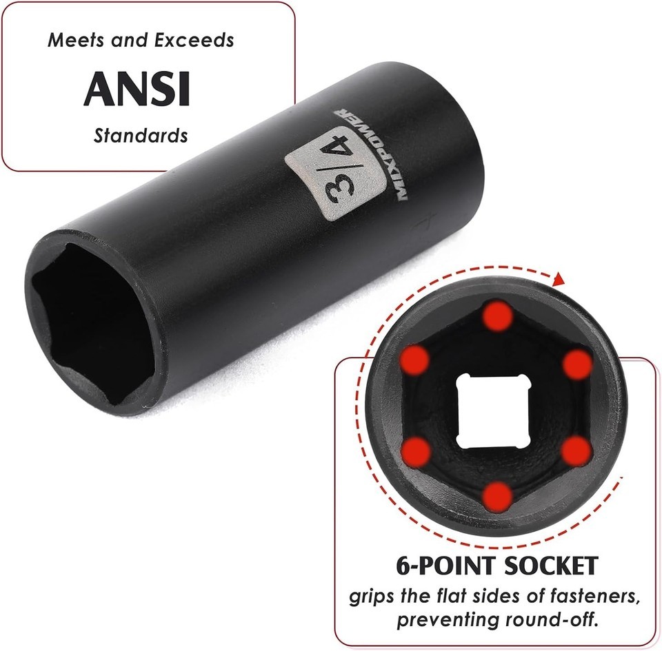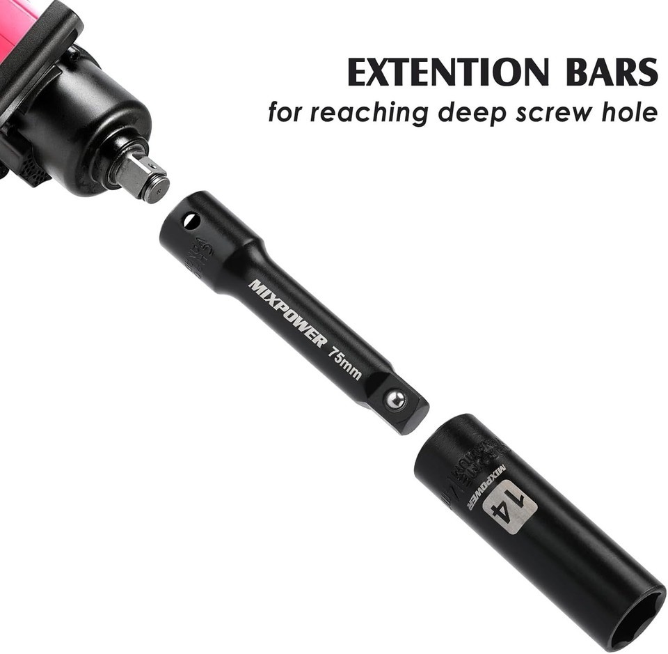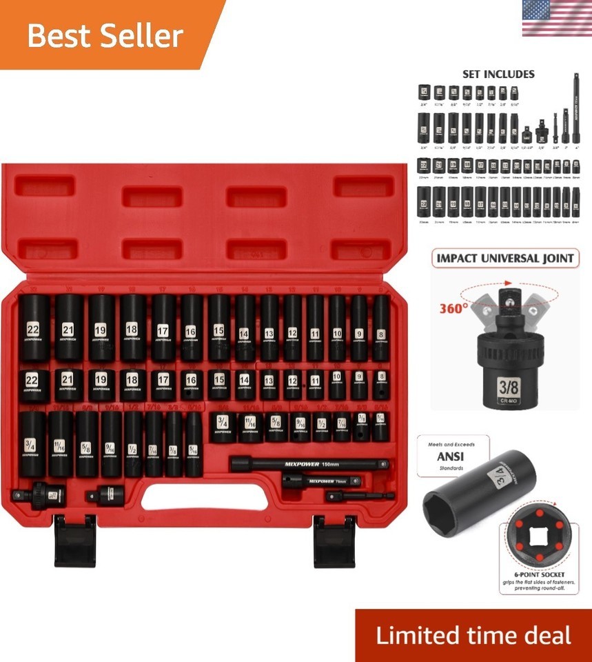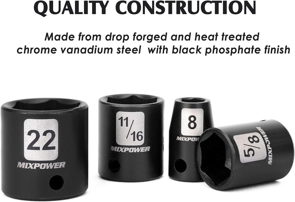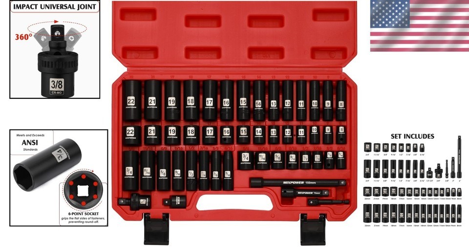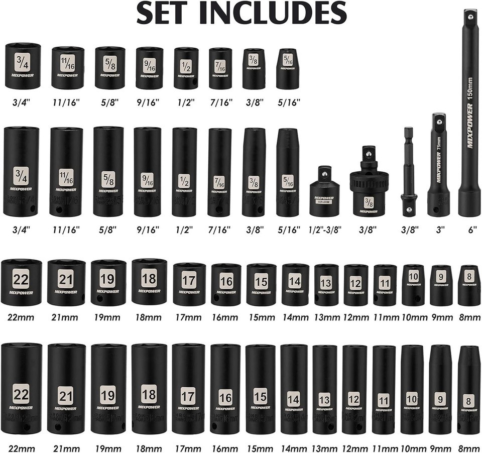 Deep/Shallow Impact Sockets: Features both SAE (5/16 to 3/4 inch) and Metric (8 to 22 mm) sockets, providing versatility to handle a wide range of fasteners.