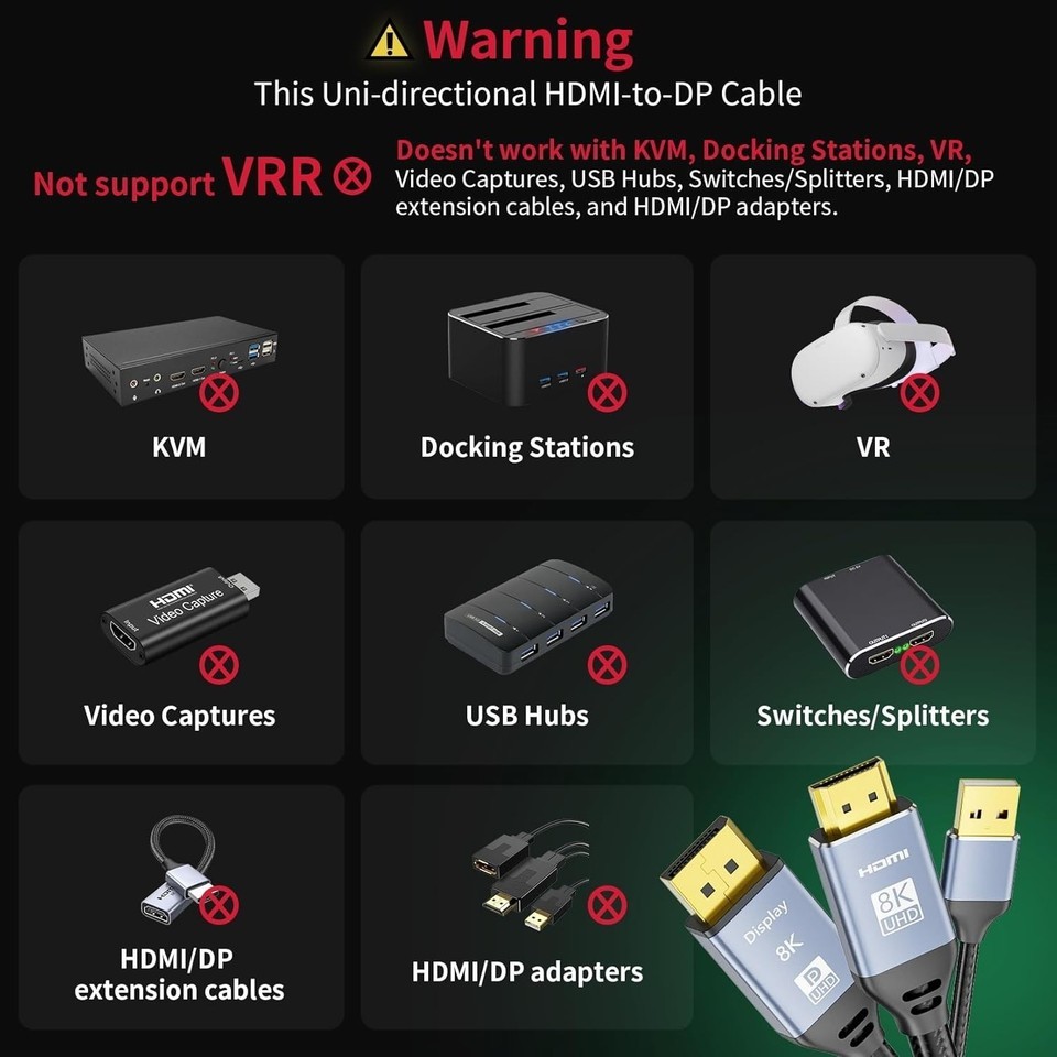 Important Note: NO VRR support. This cable cannot accommodate second conversions and will not work with a VR headset, docking station, video capture devices, switchers/splitters, KVMs, or extension cables.