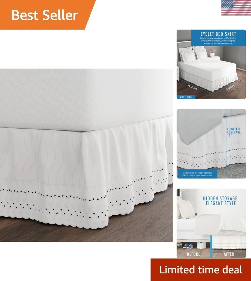 Elegant Ruffled Eyelet Bed Skirt, 14" Drop for King Beds - Timeless White Charm