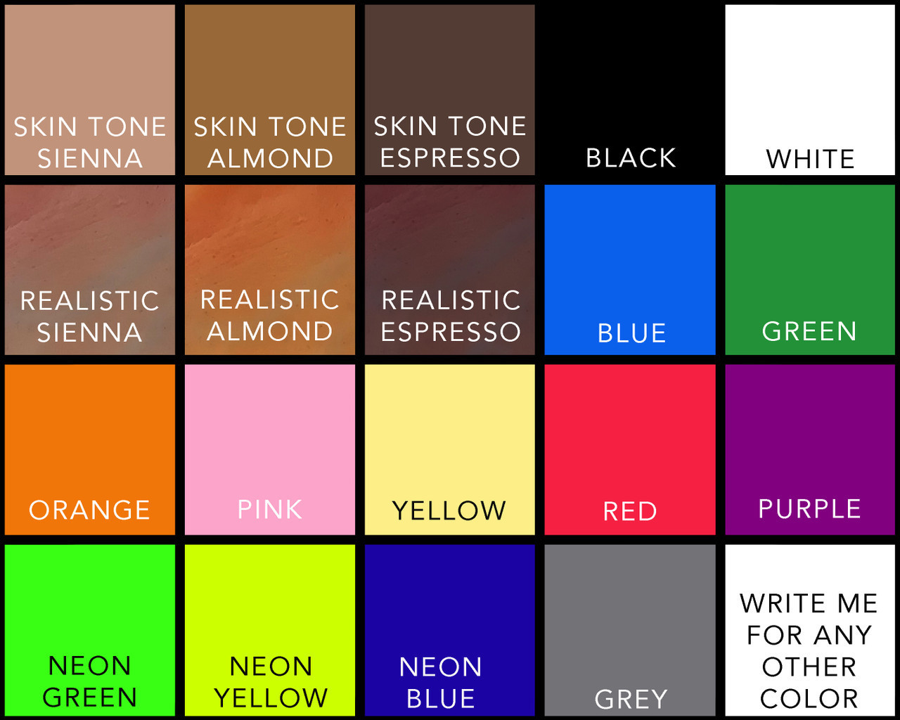 COLOR: Realistic colors are made with various shades of colors and with the techniques used in creating special effects. For custom colors or special requests such as pigments or fluorescent color please contact me. I do my best to keep the color as close as possible to the reference color but consider that screen and camera setting might change perception of colors. Are the colors lasting? It's not easy to answer this question, so I'll use an example to simplify. I bought a nice designer shirt before the summer. I've used it several times and obviously put it in the washing machine several times. After two months and a dozen washes, the color is no longer what it used to be, it has faded and the fabric is less soft than when it was new. If I had left it in my closet all summer without using it, the color would still be perfect. I do my best to ensure that the color of my products is long lasting and I recommend that you follow the instructions to keep it as long as possible but consider that the use of any product (a smartphone, a car, a dress, a pair of shoes) irreparably creates wear and tear on the product itself.