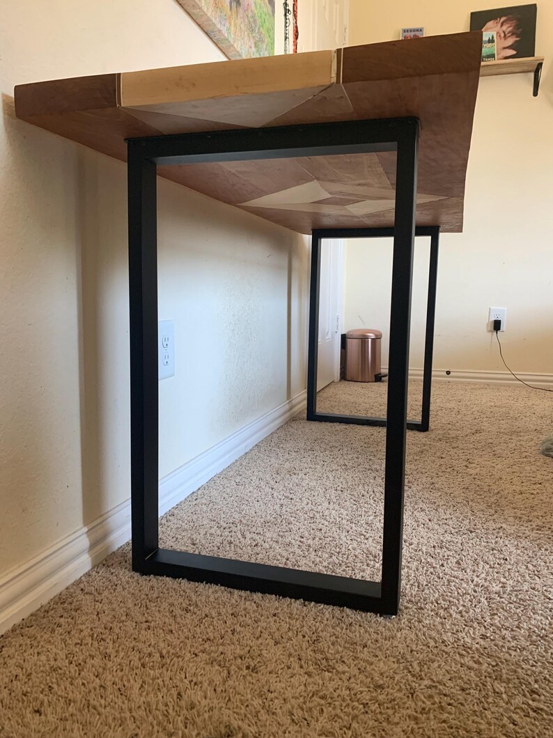 The base of the desk features strong, square metal legs with a clean, modern silhouette. This steel frame gives the piece a bold industrial aesthetic while providing exceptional stability and support, making the desk sturdy enough for heavy daily use. The striking contrast between the warm wood top and sleek metal legs gives the desk a modern rustic look that works seamlessly in a variety of interiors โ from contemporary lofts and minimalist apartments to farmhouse-inspired offices and professional executive settings.