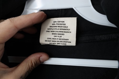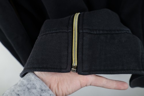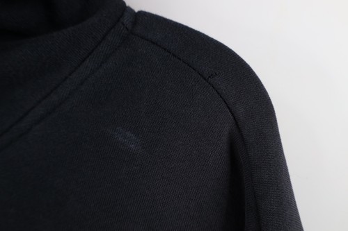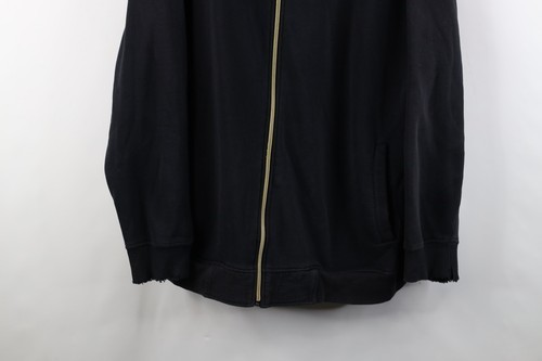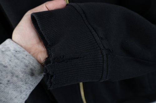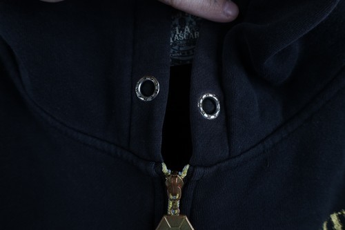 Missing string. Cuffs ripped, have holes. Designs on back ripped. Dark spots, blemishes throughout, and cuffs. Hood, cuffs discolored. Graphics, color faded. Hole left shoulder. Zipper pull tarnished. Color faded. Pilling. Loose threads front along zipper. Pin holes collar