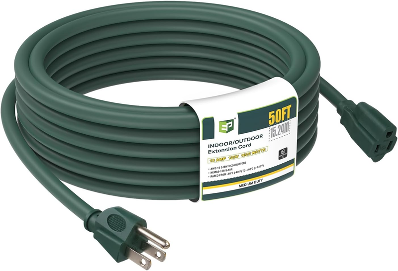 50 Ft Outdoor Extension Cord - 16/3 SJTW Durable Green Electrical Cable With