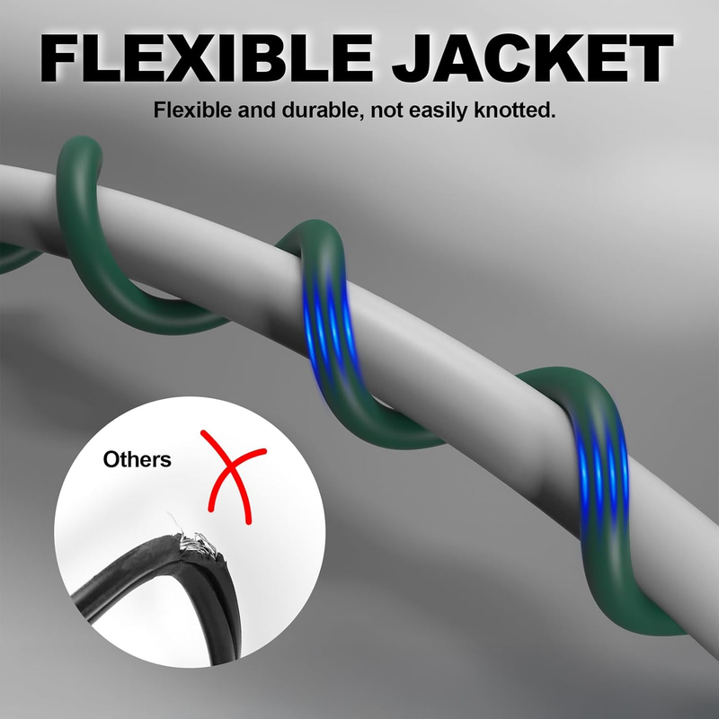Safety, Flexible, All-Weather - 3 prong grounded plug for added safety. Remain flexible and tangle-free under all weather conditions and wouldn?t become stiff or crack in cold weather.
