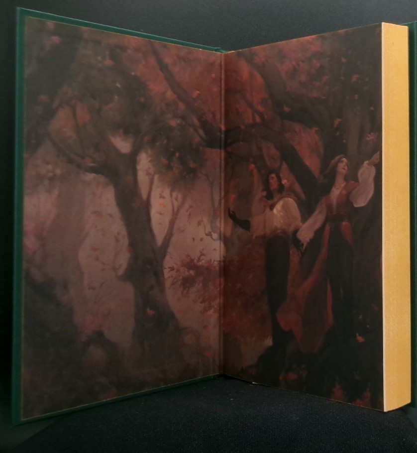 Fine, square, and firm in green boards with copper foil embossed elaborate decorations and illustrations to the front and rear covers, copper foil embossed titles and decorations to the spine, color autumn character scene illustrated front end-papers, alchemist room and character color scene illustrated rear end-papers, green headband and tail-band, sewn-in golden silk ribbon marker, all page edges rich amber; in a fine dust jacket with titles and decorative door-frame in gold foil; verso of jacket is a satin-finished character scene poster, all art by Niall Grant.