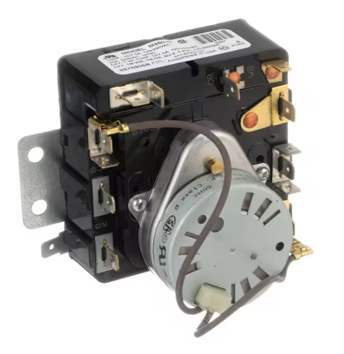 The Whirlpool M460-G, 011-67033-04, 8578906B Timer is a genuine OEM replacement part for Whirlpool dryers. Designed for 60Hz operation, this timer regulates the duration and sequence of drying cycles, controlling functions such as heating, tumbling, and shut-off. If your dryer won?t advance, stops mid-cycle, or runs too long, replacing the timer restores dependable drying performance.