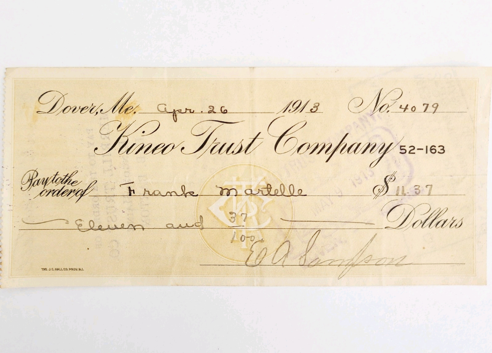 1913 Kineo Trust Company Bank Check E.A. Sampson Dover Maine Signed 4079 CHX6