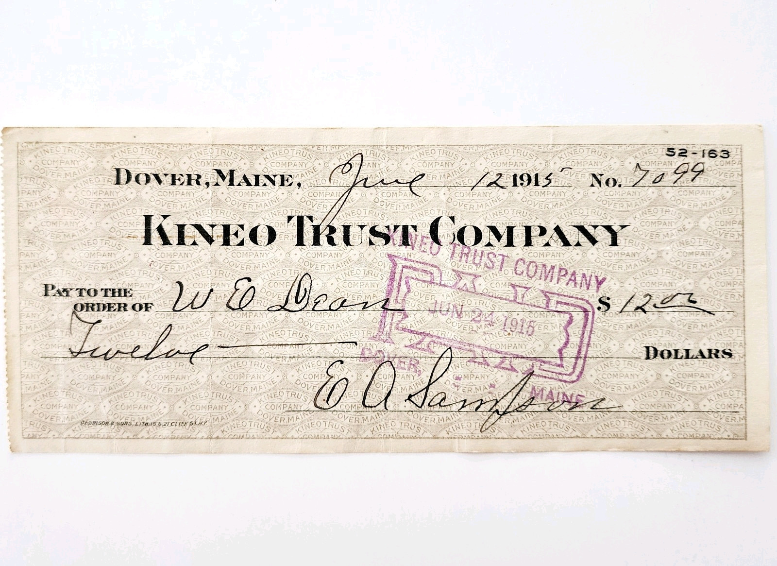 1915 Kineo Trust Company Bank Check E.A. Sampson Dover Maine Signed 7099 CHX14