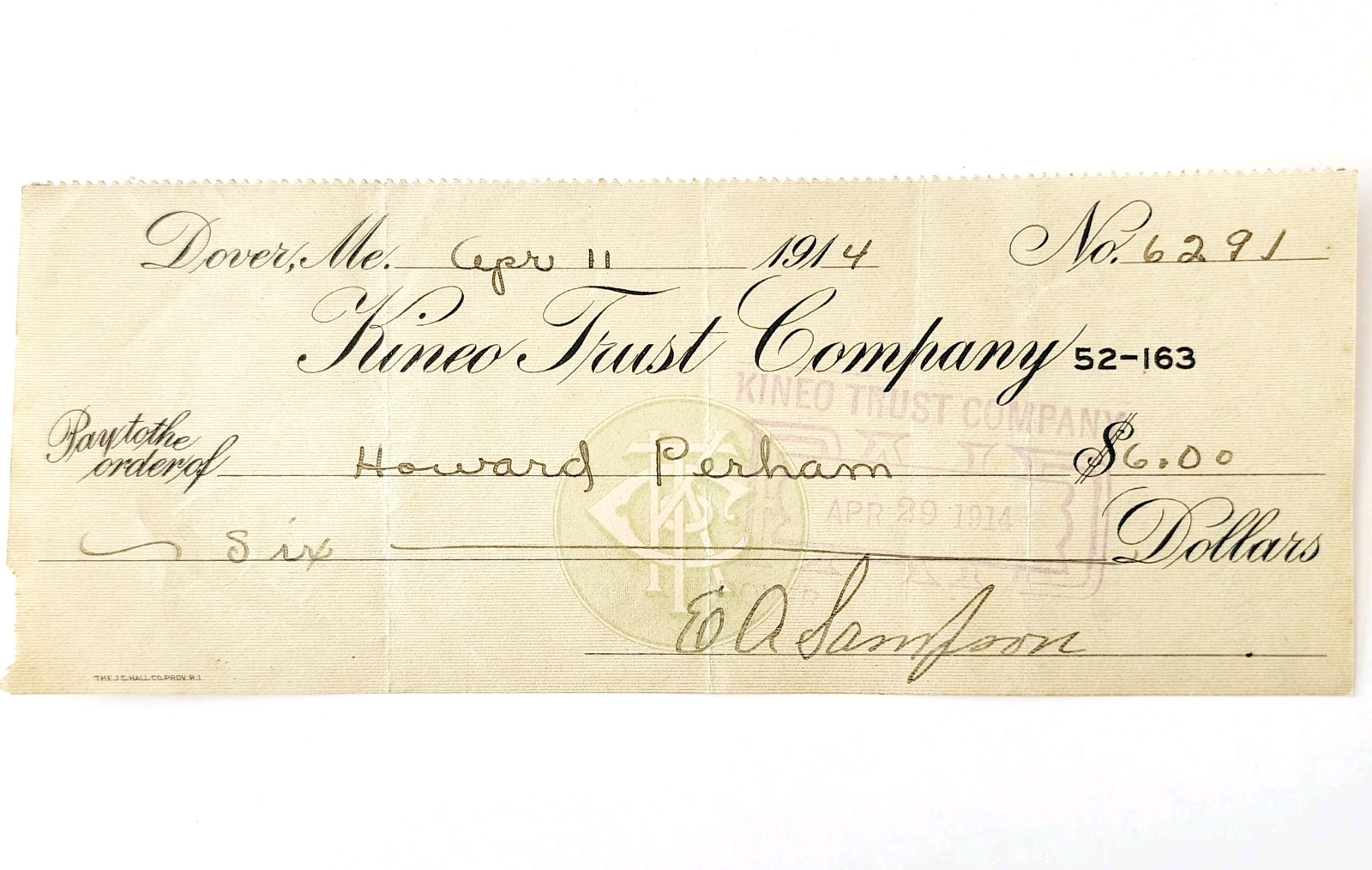 1914 Kineo Trust Company Bank Check E.A. Sampson Dover Maine Signed 6291 CHX9