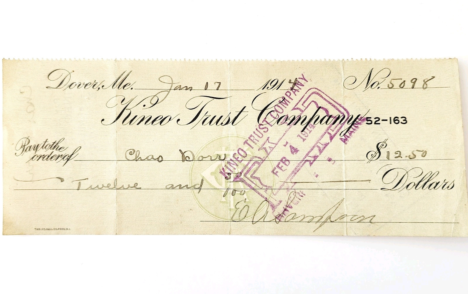 1914 Kineo Trust Company Bank Check E.A. Sampson Dover Maine Signed 5098 CHX9