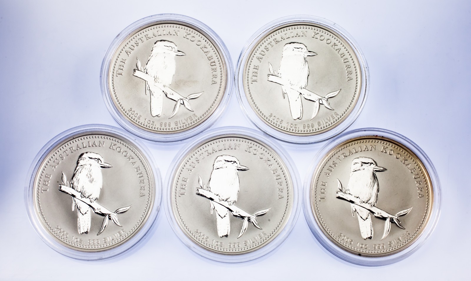 Lot De 5 2005 Australie 1 $ Argent 1oz Kookaburra (État BU) KM# 883