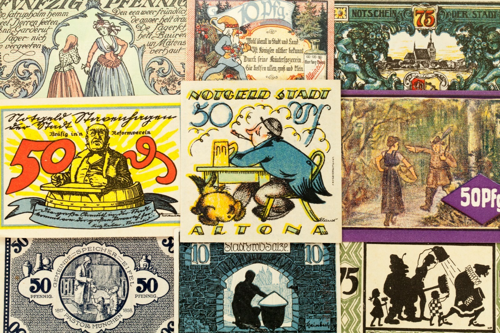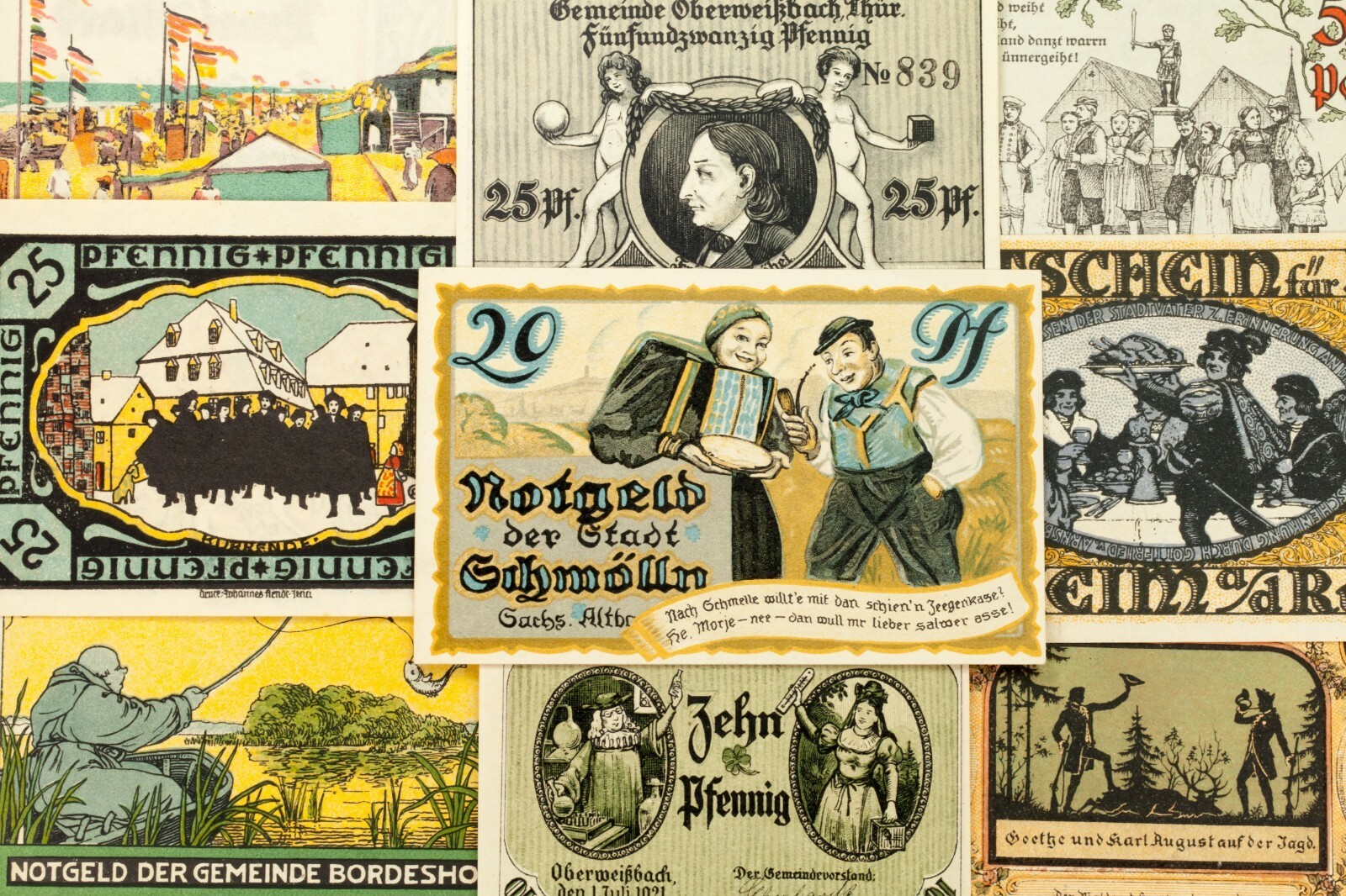 Este lote incluira 25 notas individuales de Notgeld de Alemania despues de la Primera Guerra Mundial. Todos estaran en condicion sin circular a no circuladas (AU-UNC). Valores de cara entre 5 pfennig a 5 marca. Tema de personas, grupos e individuos. No hay duplicados.