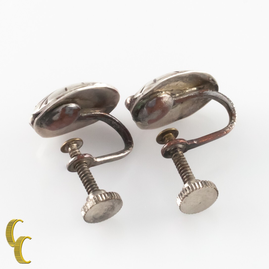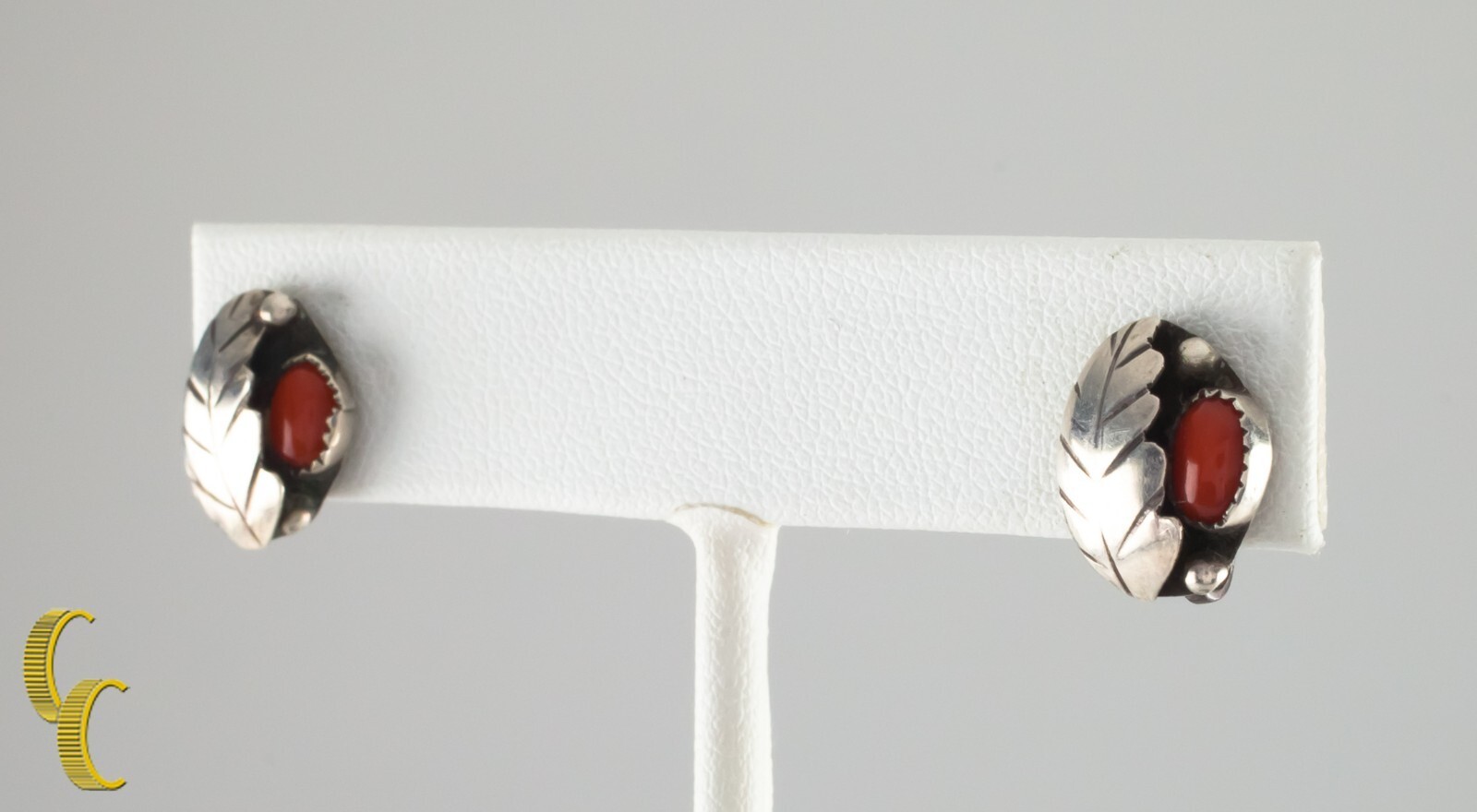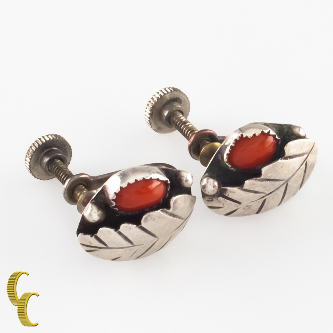 Argento Sterling Vite Su Stretto Corallo Foglia Orecchini Vintage Navajo
