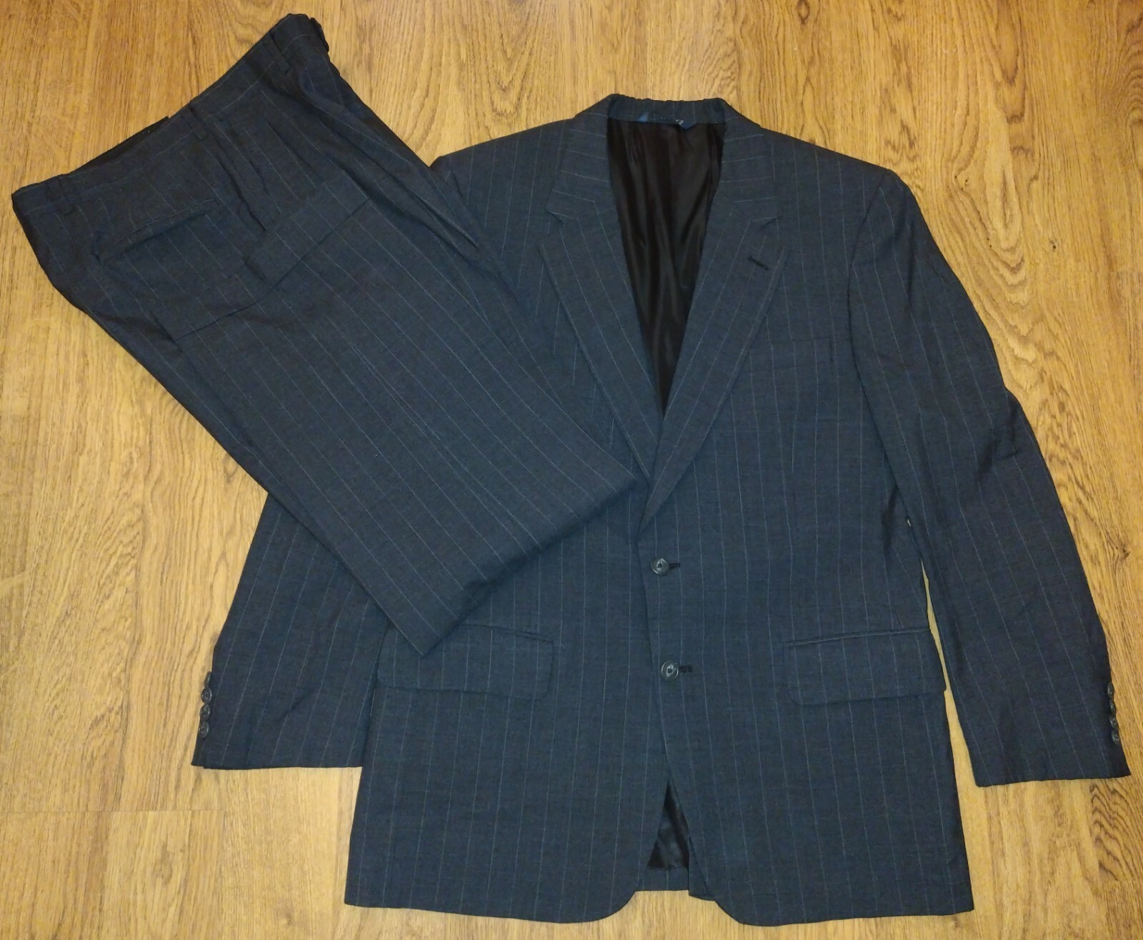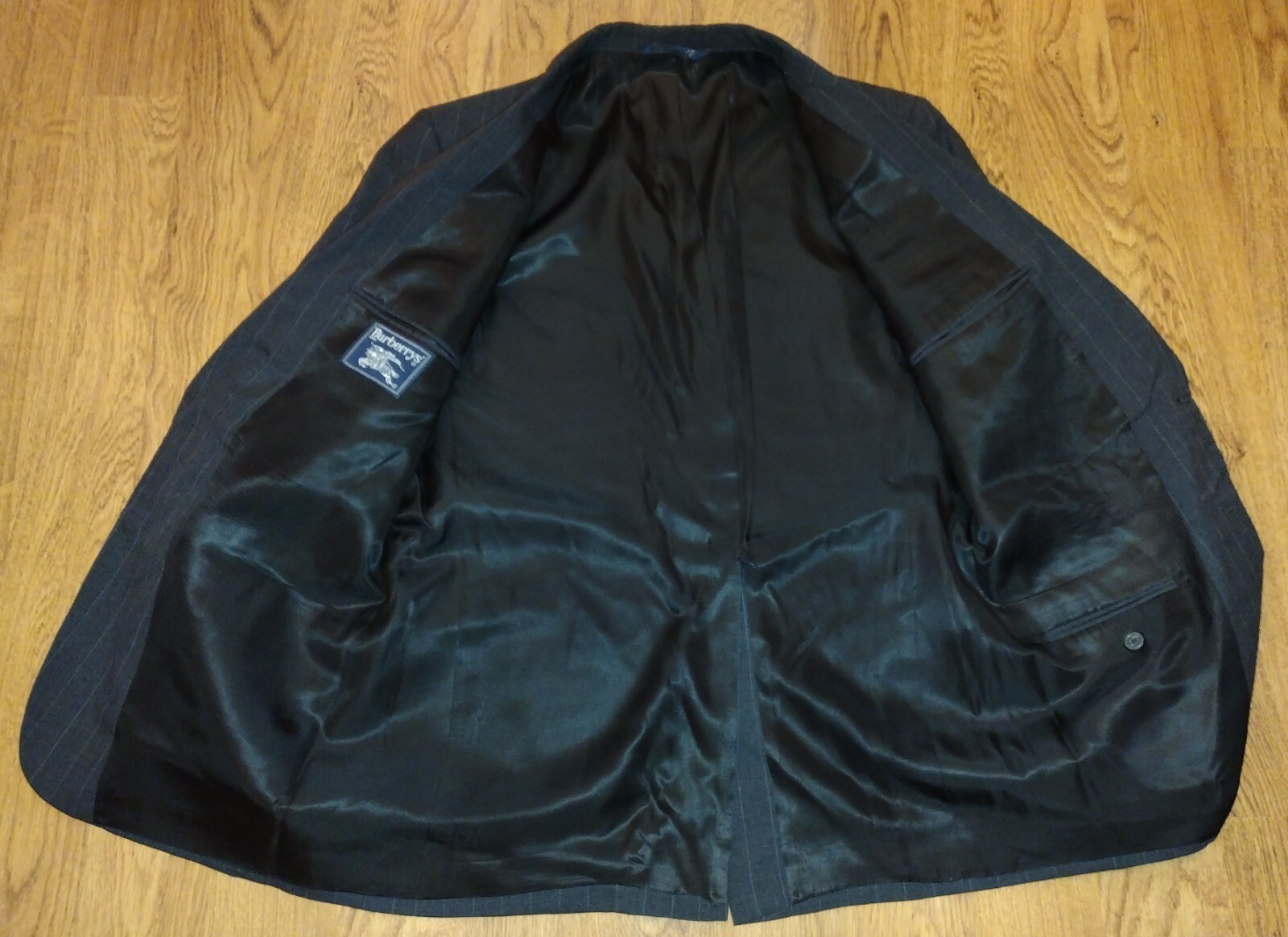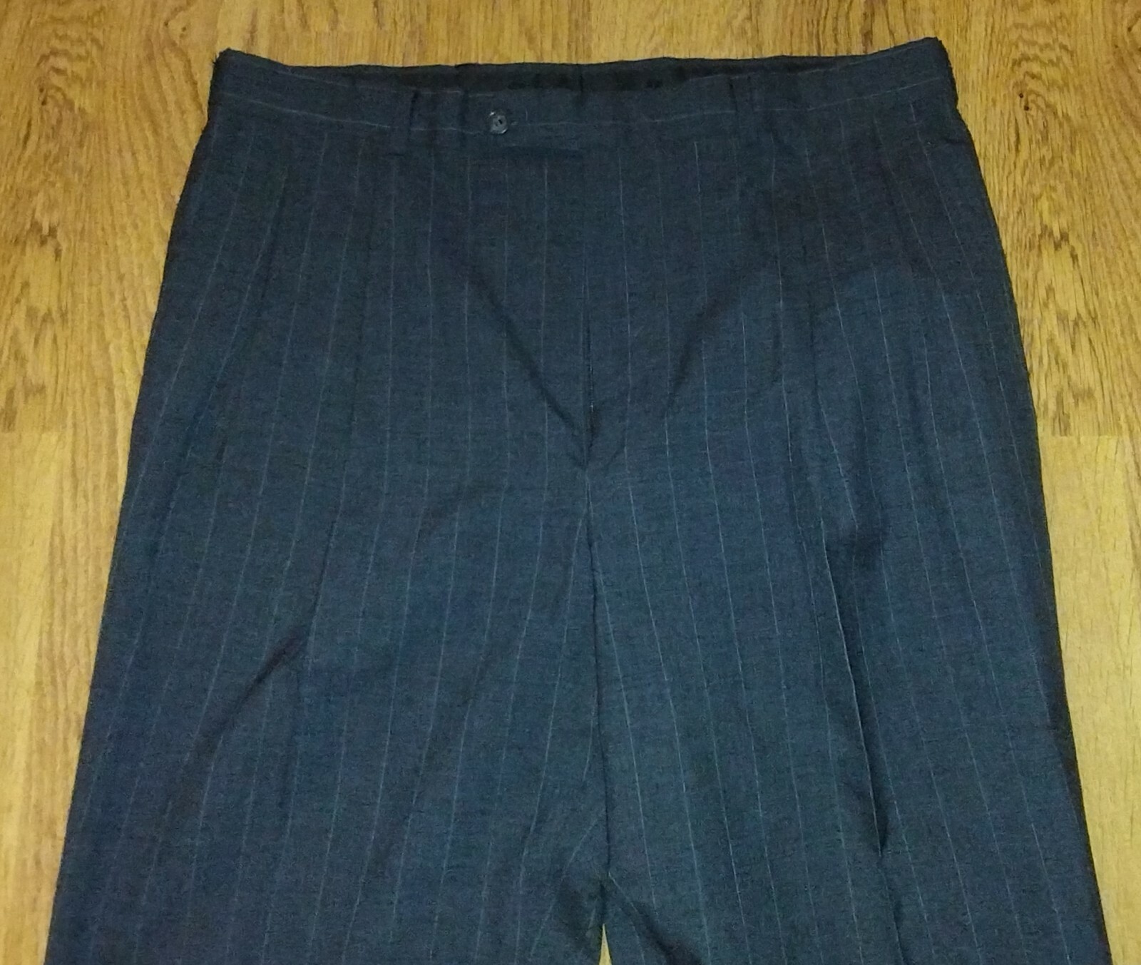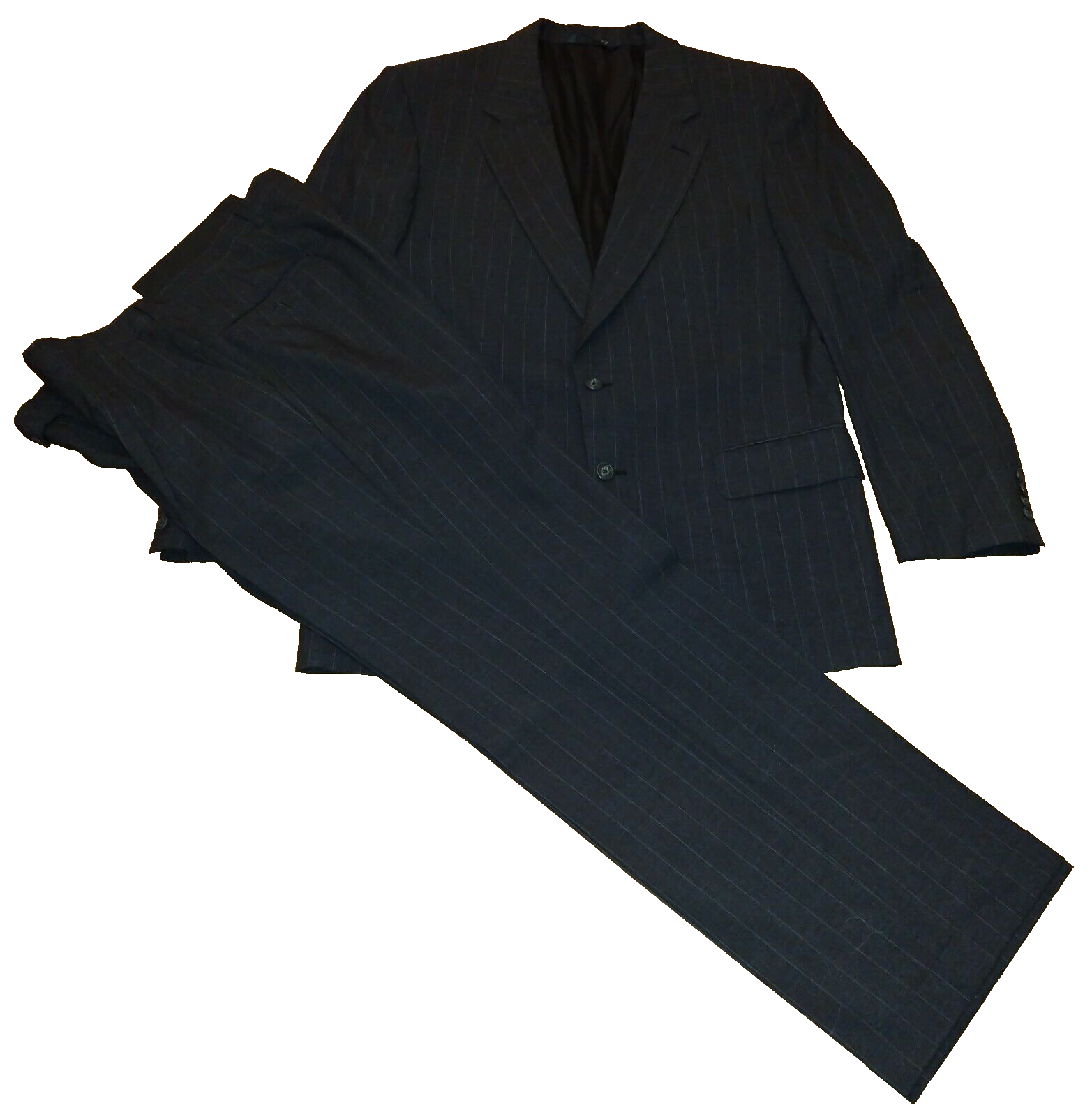 Pre-Owned Burberry Pin Striped Pleated Front Two Piece Suit Blue Coat 40R / Pants 34/29. The suit comes as shown in EXCELLENT pre-owned condition. The coat is a 40R, 31.5" length, 18.5" seam to seam shoulders and 25" sleeves. The pants are a 34" waist, 29" inseam and 42" overall (waist to cuff). The pants are pleated and they have a cuff.