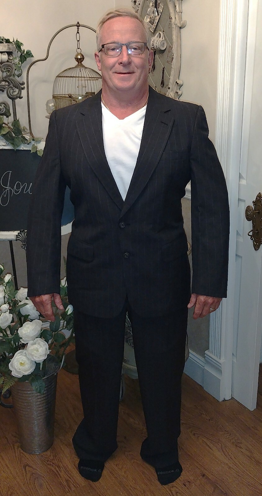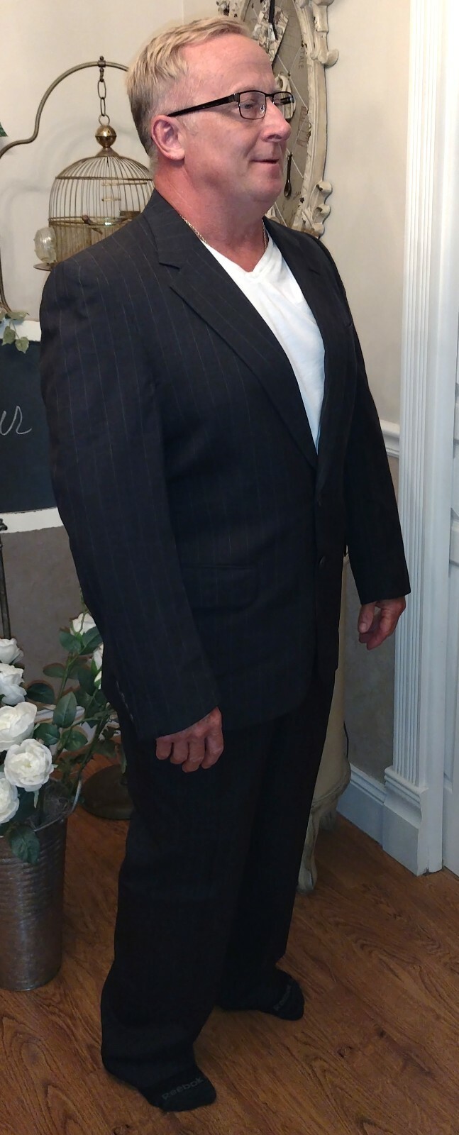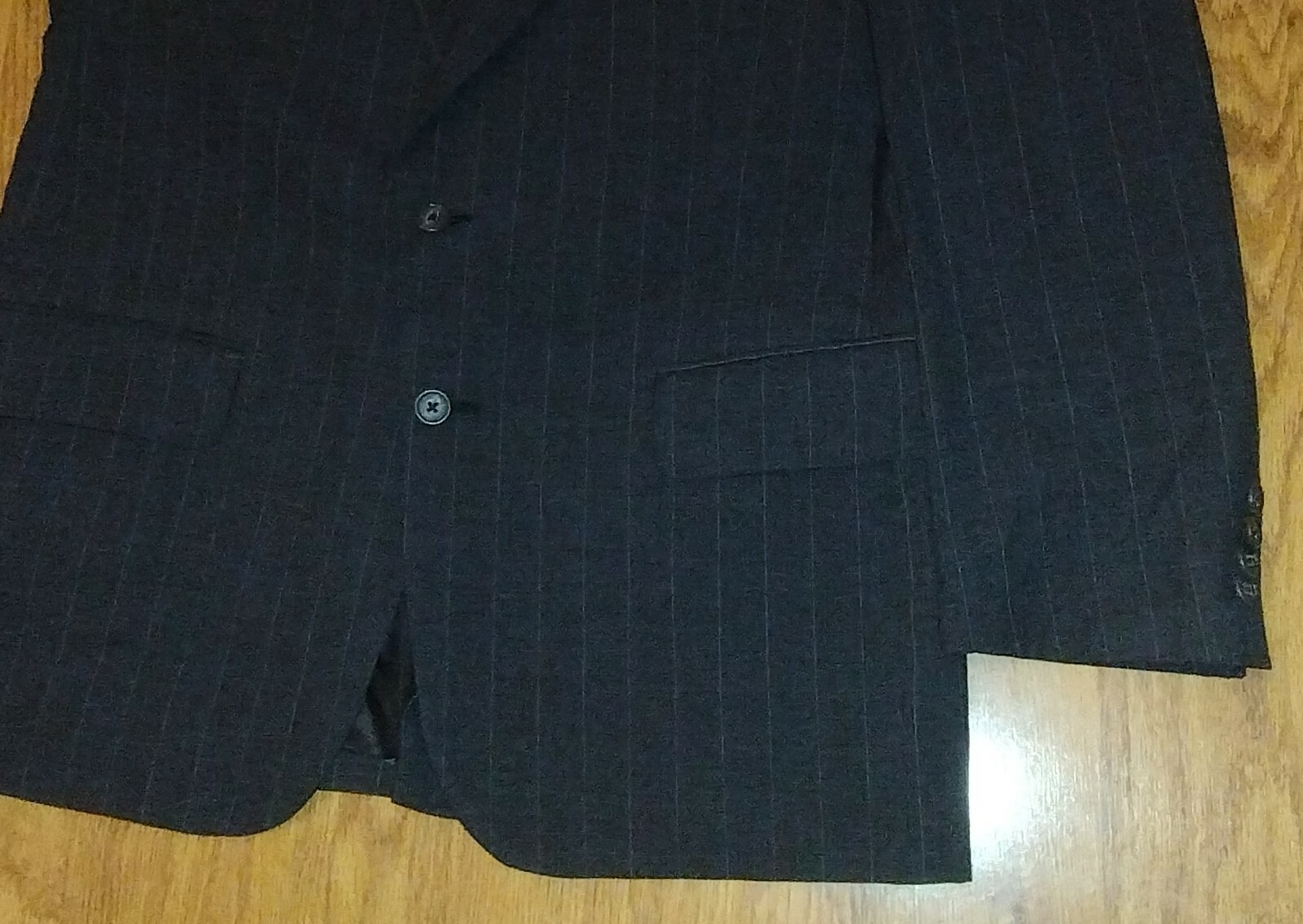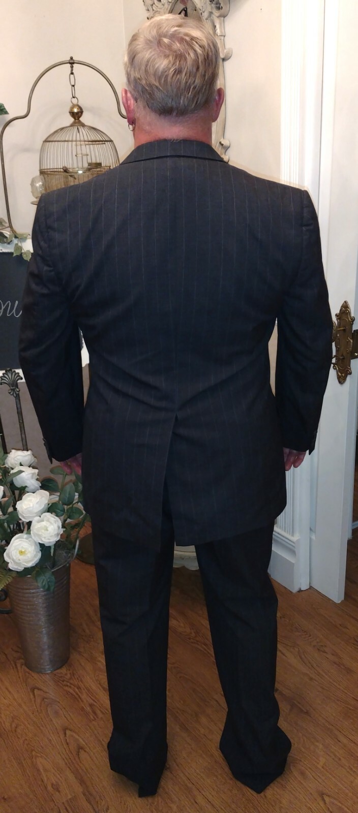 Pre-Owned Burberry Pin Striped Pleated Front Two Piece Suit Blue Coat 40R / Pants 34/29. The suit comes as shown in EXCELLENT pre-owned condition. The coat is a 40R, 31.5" length, 18.5" seam to seam shoulders and 25" sleeves. The pants are a 34" waist, 29" inseam and 42" overall (waist to cuff). The pants are pleated and they have a cuff.