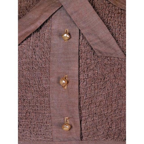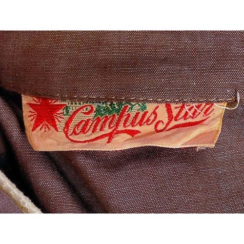 Campus Star was a popular mid-20th century junior?s label producing fashionable but affordable dresses for high school and college-aged women. This dress exemplifies 1940s campus fashion ? crisp cotton, smocked details, padded shoulders, and tailored waists for everyday wear. The changeable cotton fabric adds a subtle sheen and color shift, a textile innovation embraced during the decade.