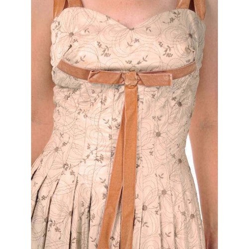 Carlye was a higher-end mid-century American fashion label, producing stylish and well-made women?s dresses during the 1940s?60s. Their pieces are sought after today for their quality textiles, feminine tailoring, and elegant detailing. This embroidered cotton sundress, trimmed in velvet ribbon, demonstrates Carlye?s focus on both durability and luxury aesthetics.