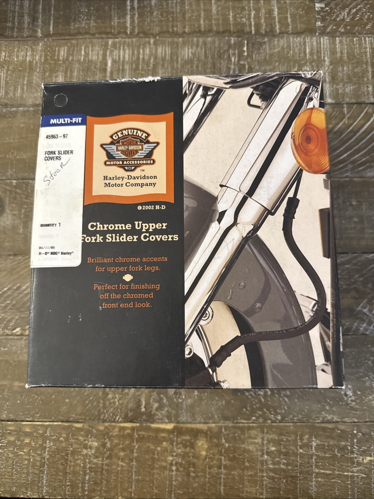 The product is a set of NOS Harley Davidson Upper Fork Slider Covers with the manufacturer part number 45963-97. Made of chrome, these covers are designed for placement on the upper part of the motorcycle's fork. As genuine Harley-Davidson parts, they are likely to be of high quality and fitment, providing a sleek and stylish look for the bike's suspension system. Perfect for customizing or replacing worn-out covers on various Harley models.