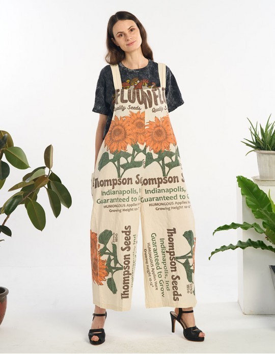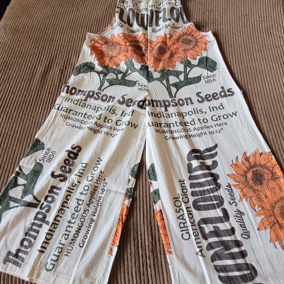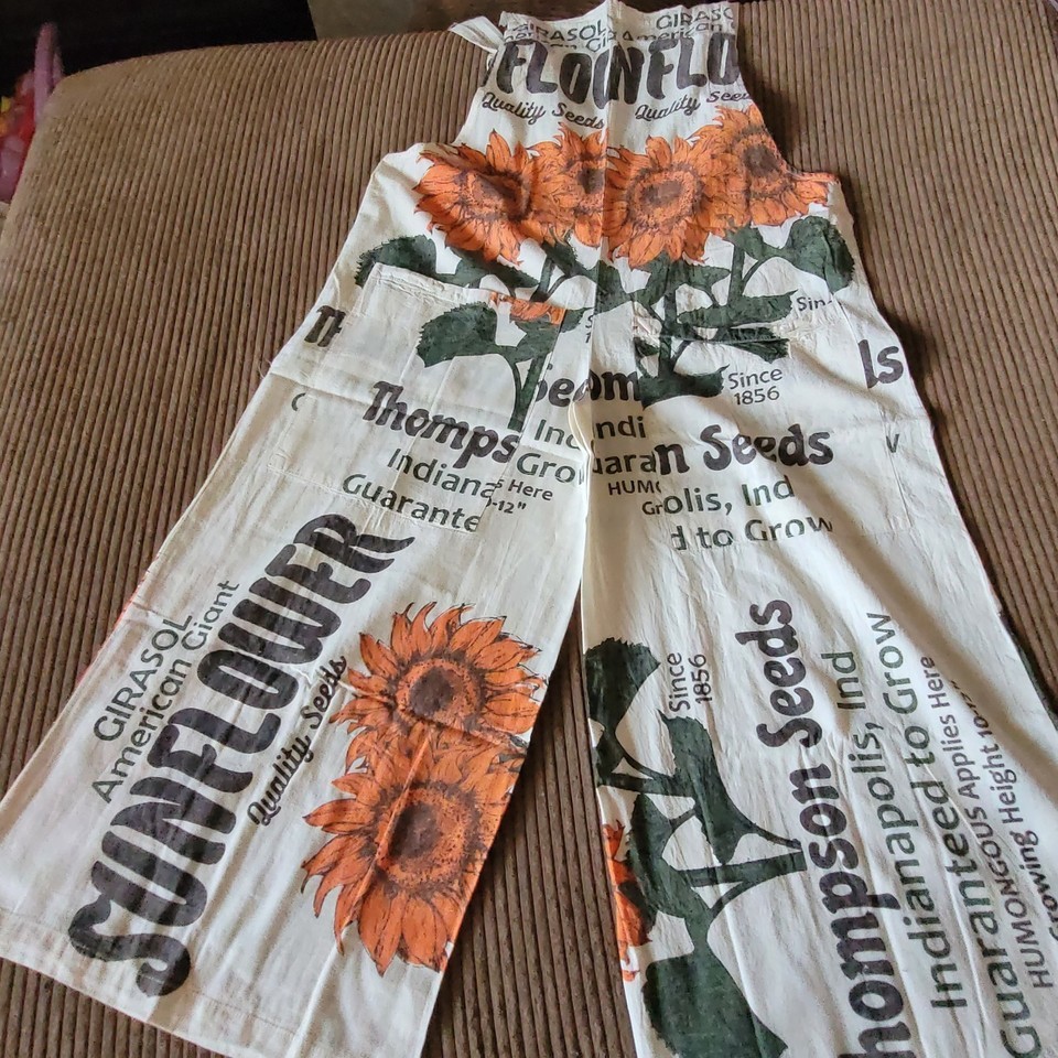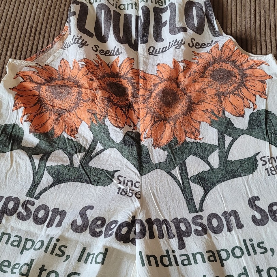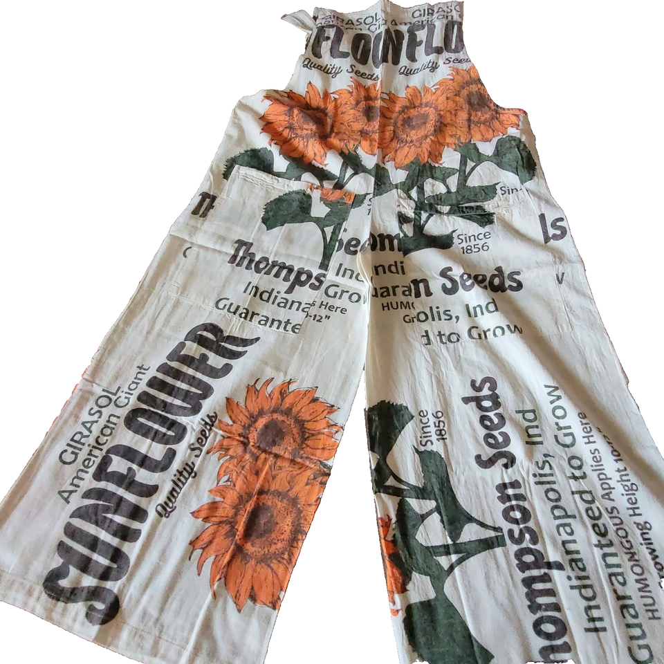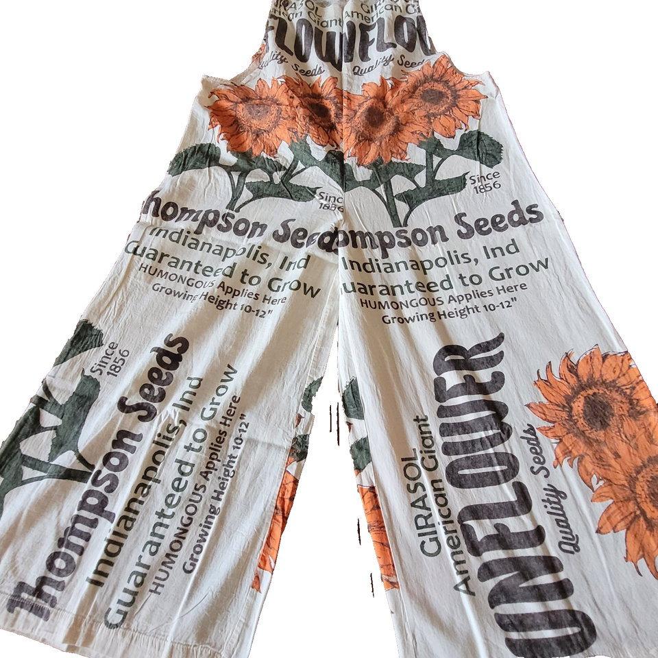 Reminiscent of an era bygone, these cotton overalls feature a vintage sunflower seed sack print with "Thompson Seeds" graphics in orange and brown tones. The originals were perhaps made with real rice sacks. They are made from 100% cotton canvas like fabric with a relaxed, loose fit and wide-leg silhouette. The distinctive print showcases illustrated sunflower throughout with text indicating "Indianapolis, Ind" and "Quality Seeds" details. Cream-colored shoulder straps provide comfortable support. These lightweight overalls pair perfectly with simple t-shirts or crop tops for casual summer outings, festivals, or creative workspaces. Machine washable.
