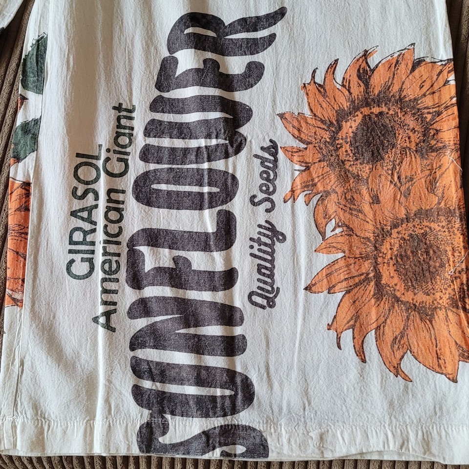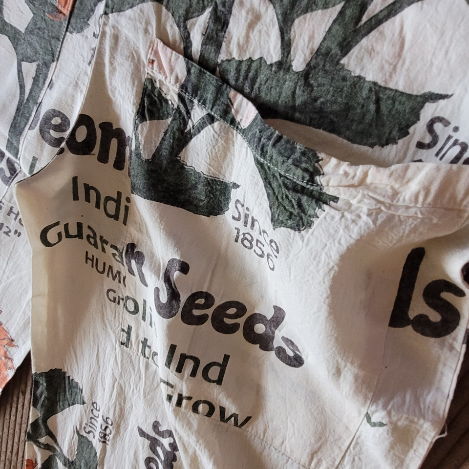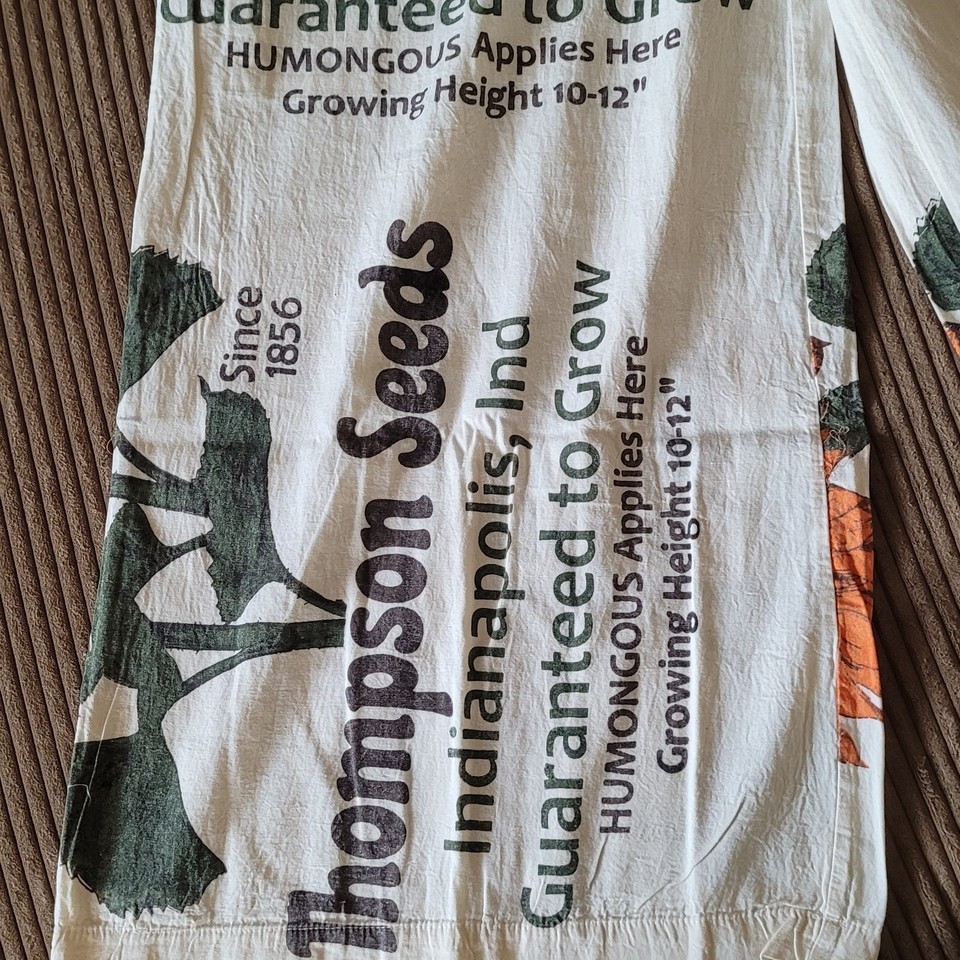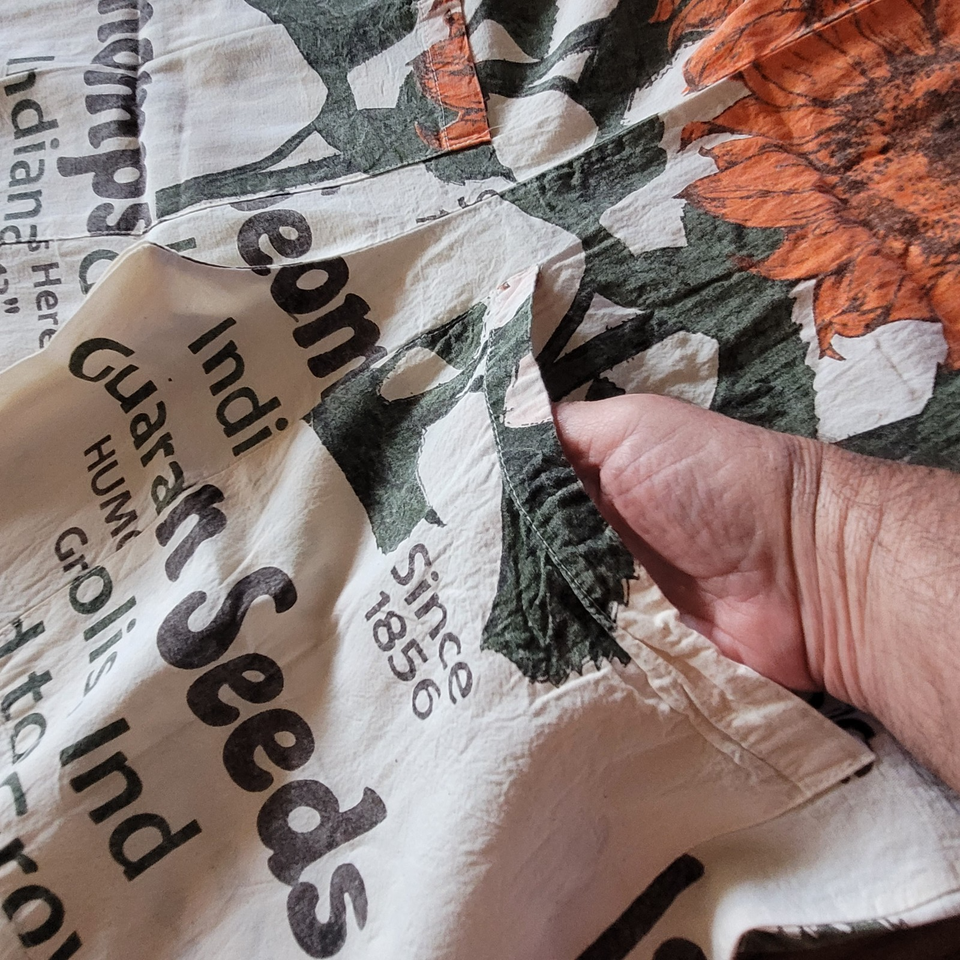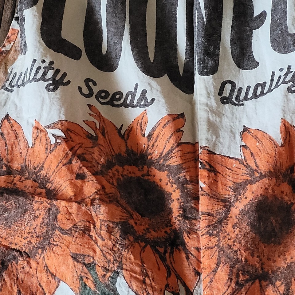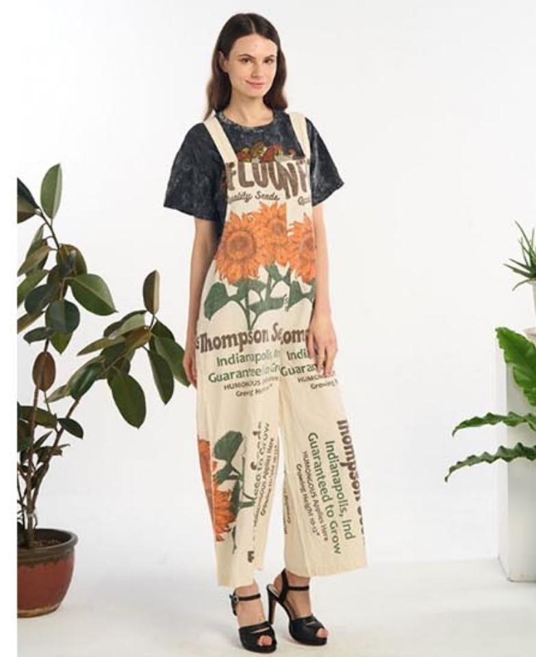 Reminiscent of an era bygone, these cotton overalls feature a vintage sunflower seed sack print with "Thompson Seeds" graphics in orange and brown tones. The originals were perhaps made with real rice sacks. They are made from 100% cotton canvas like fabric with a relaxed, loose fit and wide-leg silhouette. The distinctive print showcases illustrated sunflower throughout with text indicating "Indianapolis, Ind" and "Quality Seeds" details. Cream-colored shoulder straps provide comfortable support. These lightweight overalls pair perfectly with simple t-shirts or crop tops for casual summer outings, festivals, or creative workspaces. Machine washable.