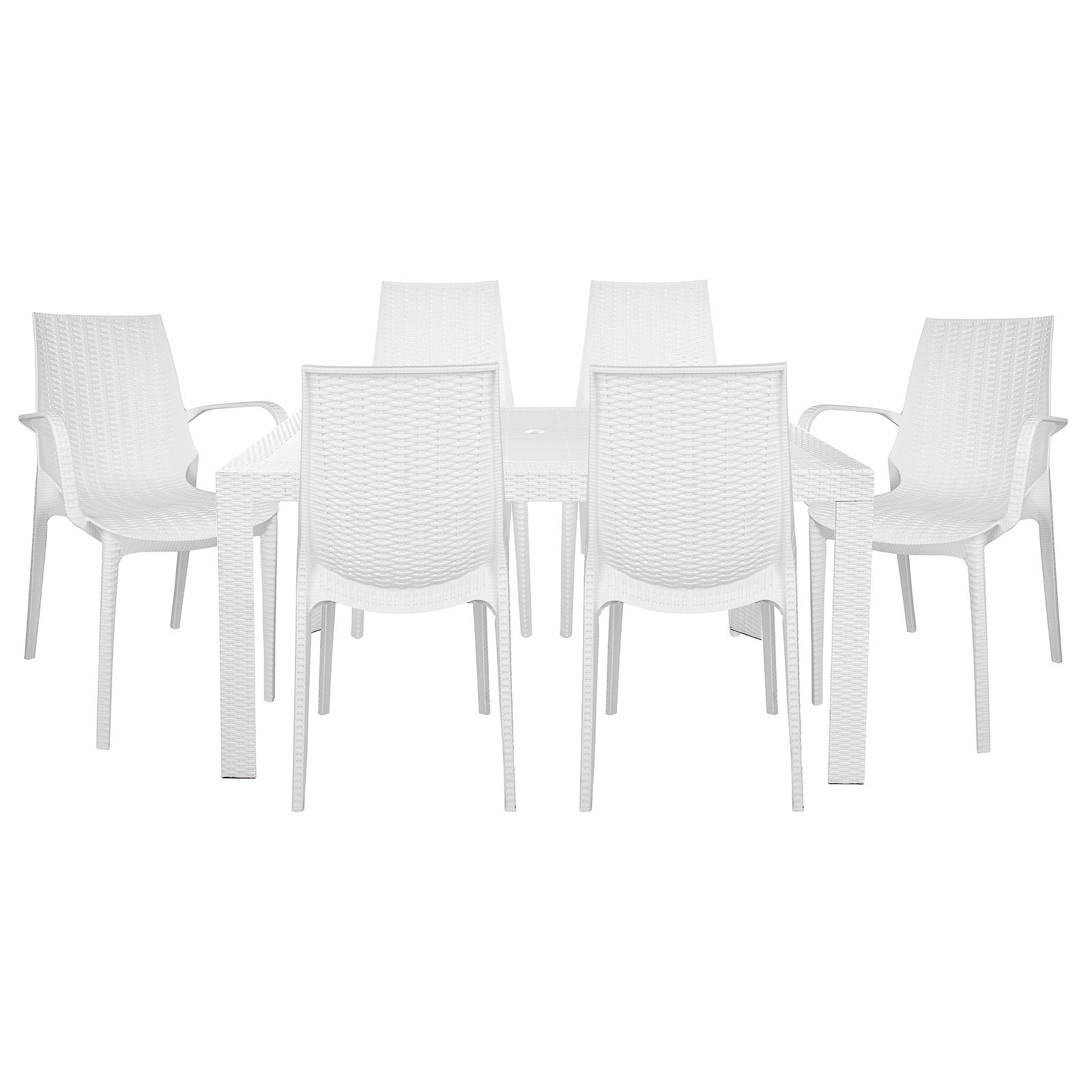 Introducing the Kent Outdoor Patio Dining Set - a perfect addition to any outdoor setting. This outdoor dining set is made from polypropylene material, designed to be durable and withstand the wear and tear of daily use. It is also water-resistant and UV-resistant, making them the perfect set for your outdoor space, no matter the weather condition. The table and chairs are also lightweight, which makes it easy to move around. It also comes with plastic cap floor protectors, which protect your floors from scratches and damage. The dining table has an umbrella hole so that you can use it with an umbrella and keep cool in the shade. It is a simple yet elegant table that is perfect for any outdoor setting. The chairs in this set are stackable, making them easy to store and save space when not in use. The Kent Outdoor Dining Set is perfect for those who love to entertain their friends and family on their porch, patio, or by the pool. With its attractive weave design, durable plastic material, and weather-resistant features, this set is sure to make your outdoor space more comfortable and stylish.