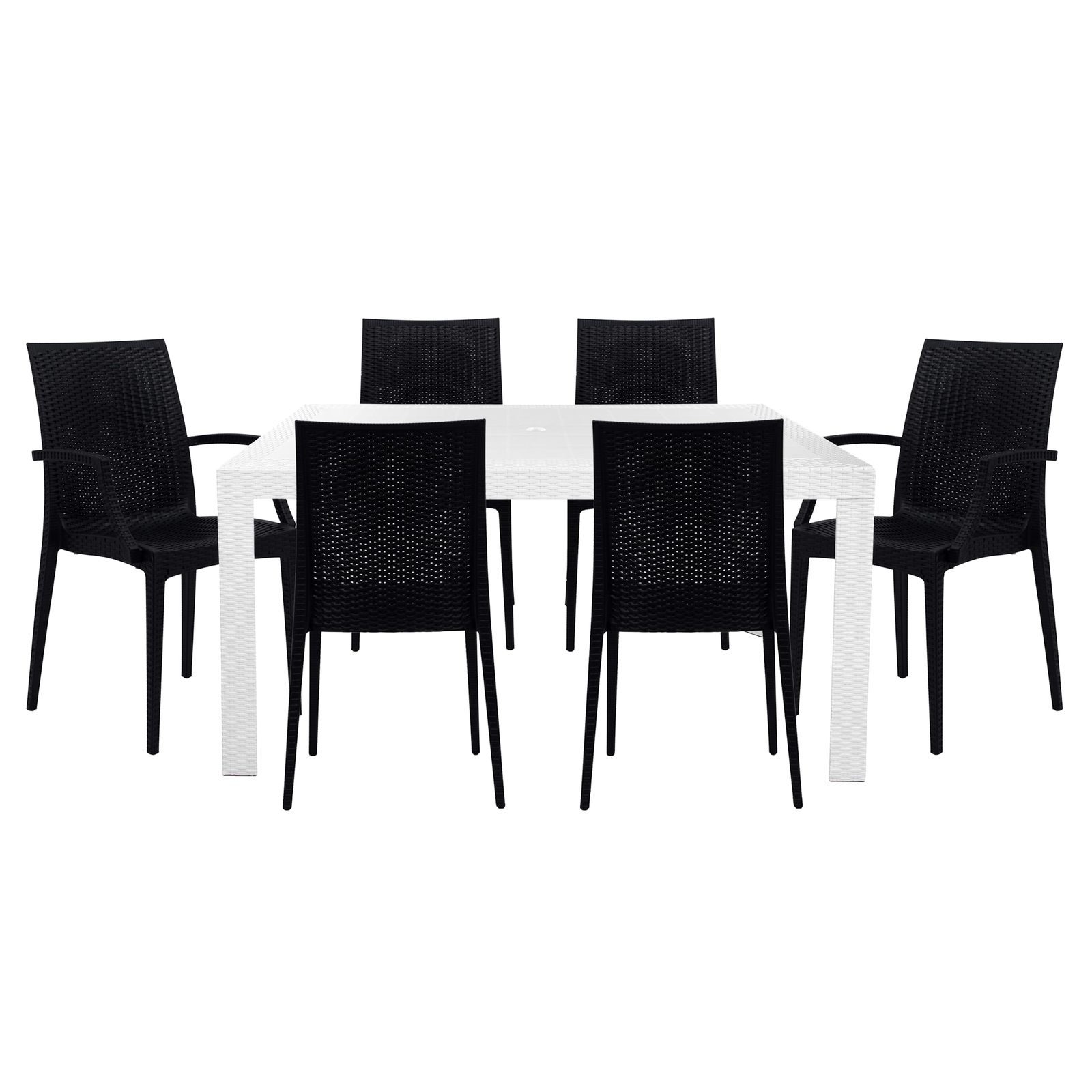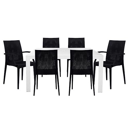 Transform your outdoor space with this 7-piece modern patio dining set that includes 4 dining chairs, 2 armchairs, and a bistro table which is durable and weather-resistant materials make it perfect for entertaining guests or relaxing outdoors. This 7-piece modern patio dining set is crafted from sturdy Polypropylene, making it durable, stylish, and comfortable seating with its sleek look and easy-to-clean surface, it's a great addition to any patio or garden. The modern dining chairs can be conveniently stacked and stored, making them save space when not in use. Elevate your outdoor dining experience with this modern 7-piece patio dining set featuring an attractive weave design. Add a touch of elegance and style to your patio with this must-have dining set. This modern 7-piece patio dining set is designed for both style and functionality as it comes complete with plastic cap floor protectors to prevent scratches and damage to your flooring. This 7-piece modern patio dining set feature to be lightweight itโs easy to move around making them a versatile addition to any patio or outdoor space. The Outdoor Dining Set is easy to assemble, and you can have it ready for use in no time. Instructions and assembly tools are included.