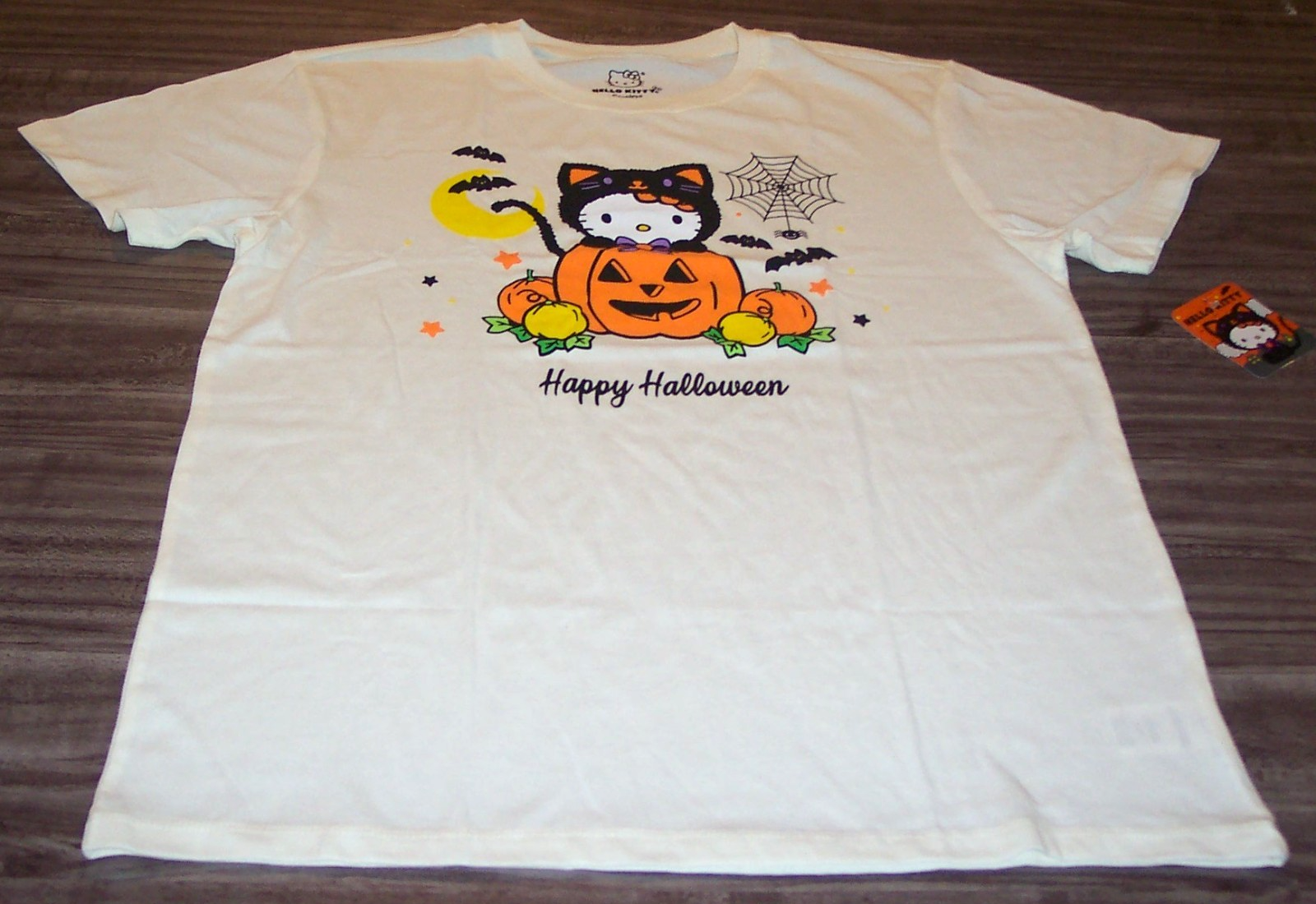 This is a Sanrio HELLO KITTY HAPPY HALLOWEEN Pumpkin T-shirt. It is a size LARGE, and it is NEW with the tag. It is 21 3/4 inches from armpit to armpit and 30 inches in length. Combine auctions to save on shipping. AD