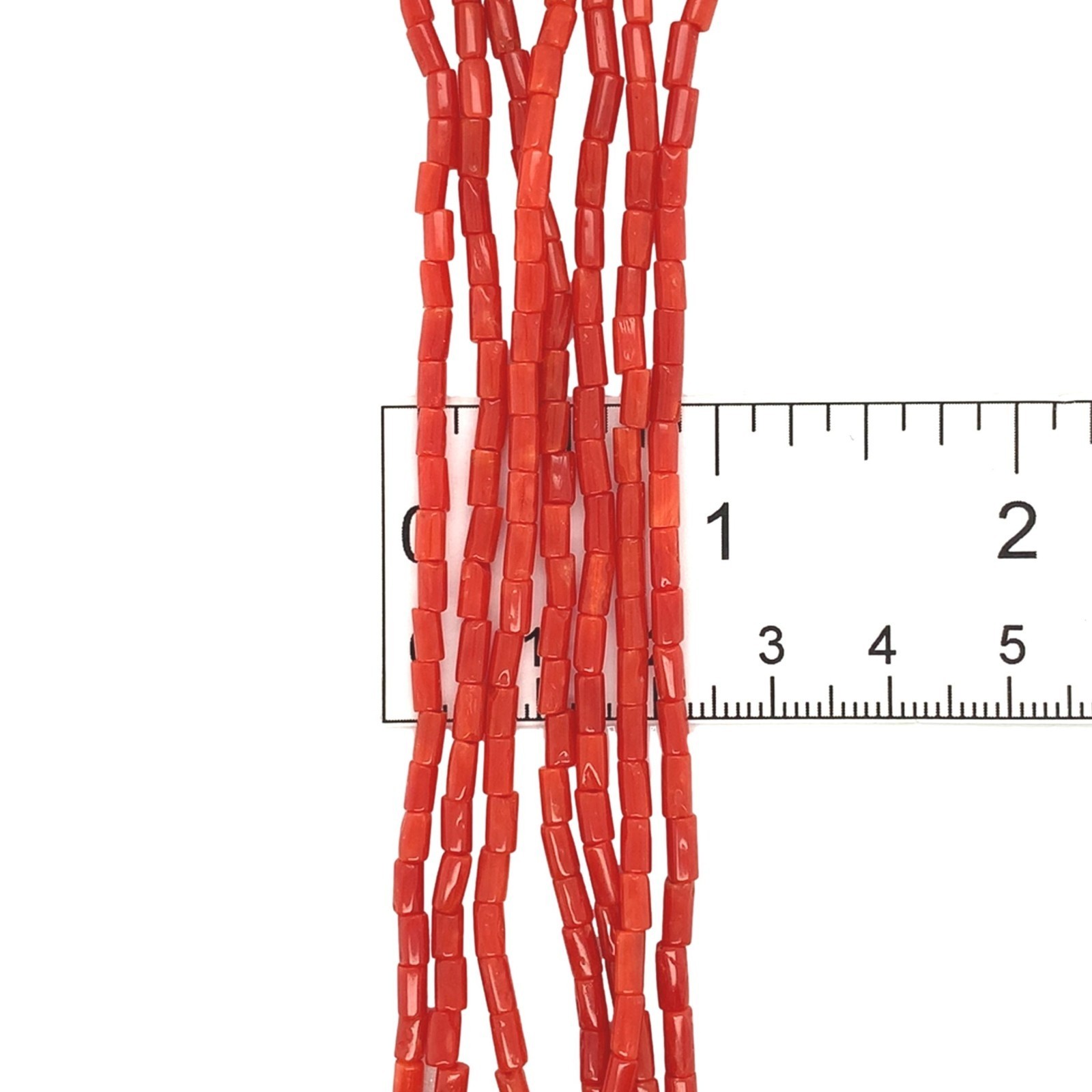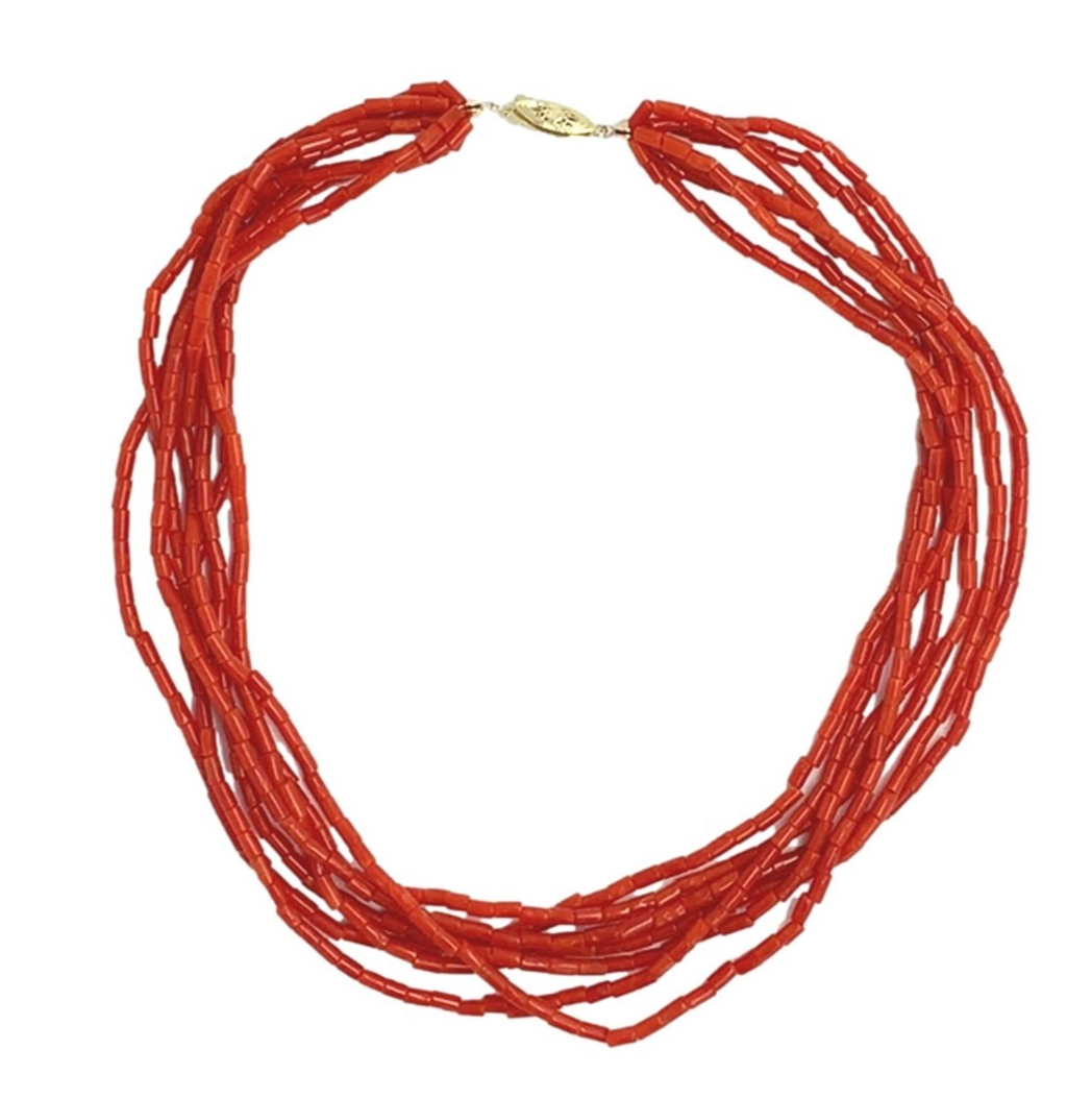 Genuine natural coral bead seven strand necklace with 14k yellow gold clasp. The tube shaped coral beads measure about 2.5 to 2.7mm wide and vary in length from about 3.5 to 6.5mm long. The beads are a fine ox blood red-orange. Freshly knotted.