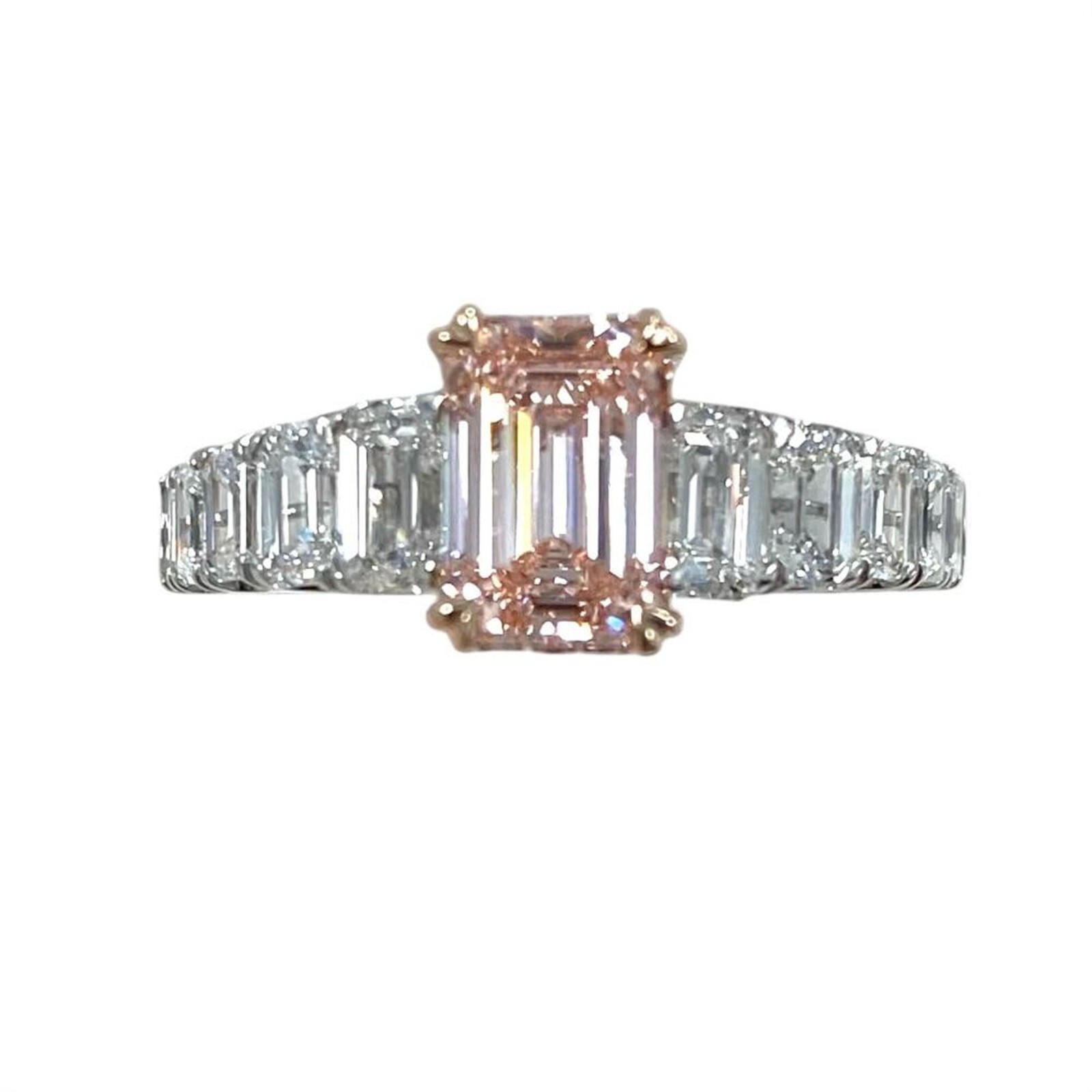 Machen Sie eine mutige Aussage mit diesem exquisiten Emerald-geschnittenen IGI-zertifizierten, ausgefallenen, intensiven, pink Labor gewachsenen Diamanten in der Mitte, und strahlt lebendige Farbtone von Romantik und Eleganz aus. Dieses Design wird von runden brillanten rosa Diamanten umrahmt und durch Emerald Cut-Labor-Diamanten erganzt und bietet eine außergewohnliche Mischung aus Brillanz und Raffinesse. Dieser Ring ist in 14 Karat Weißgold mit zarten Rosegold -Akzenten gefertigt und ist eine atemberaubende Wahl für diejenigen, die einzigartige Schonheit und moderne Luxus schatzen. Unsere Produkte sind alle von Qualitat und Pflege im Herzen des Diamond District in der 47th Street in New York City hergestellt. Unser Engagement und unser Engagement für eine gute Arbeit und Qualitat überst