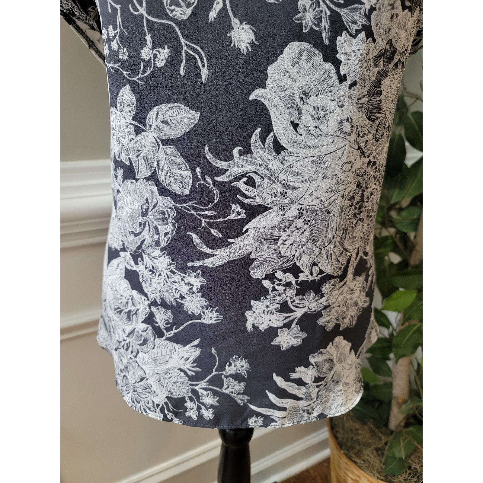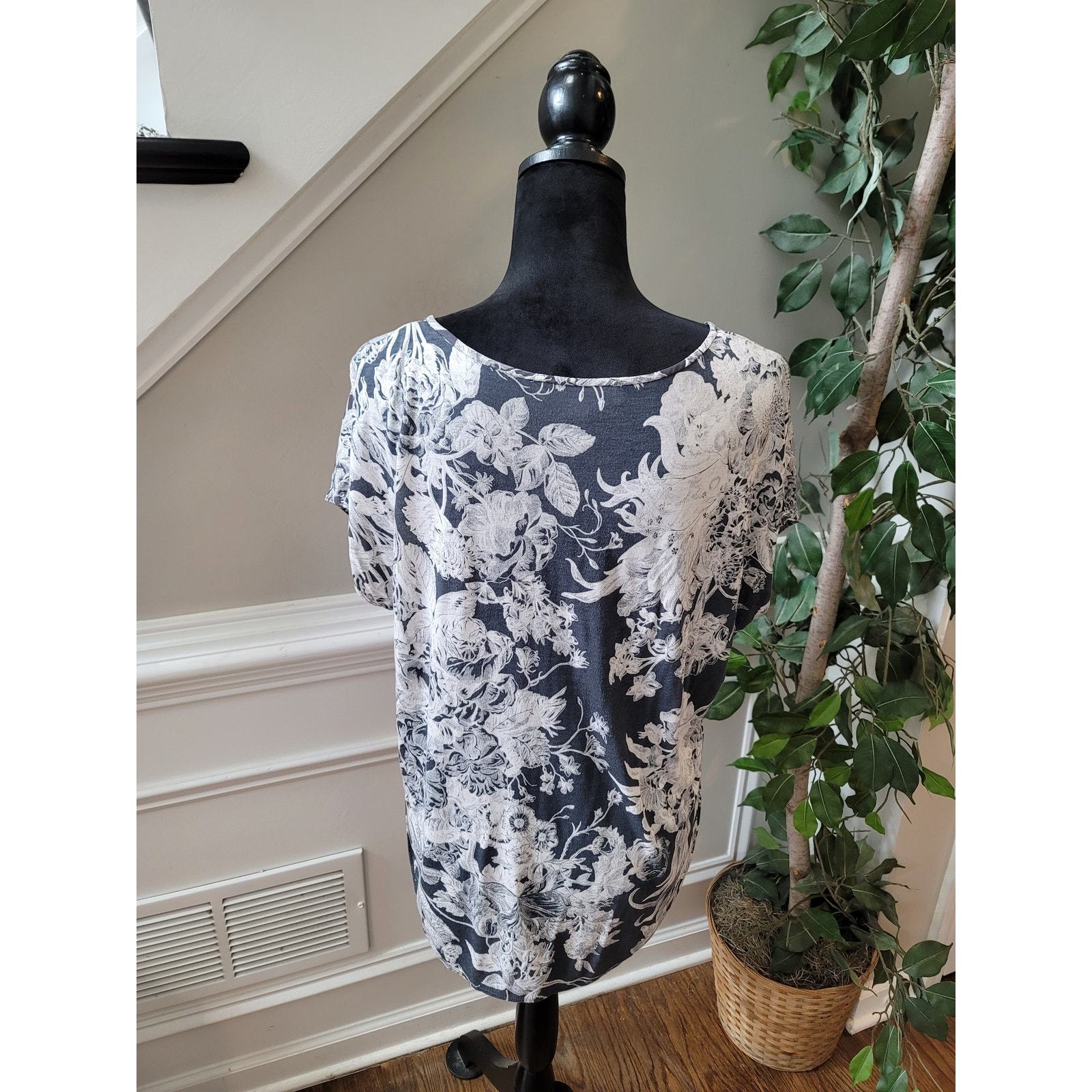 OFT women?s blouse in size Small features a striking gray and white floral print that blends elegance with everyday comfort. Crafted with a polyester front and viscose back, it offers a lightweight and breathable feel, perfect for work, casual outings. The short sleeves and classic silhouette make it a versatile wardrobe staple.
