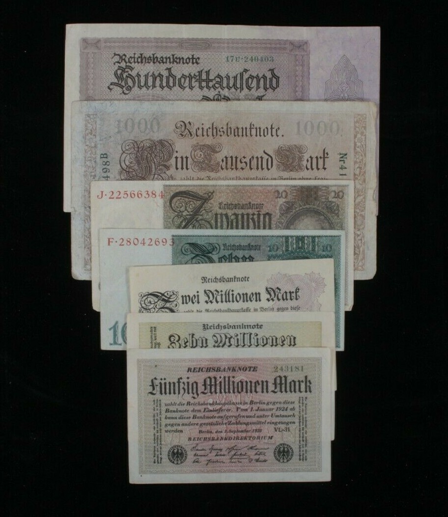1910-1929 Germany 7-Notes Set 10 Mark to 10 Million MARK Empire & Weimar