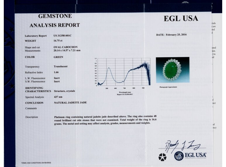 Ein EGL Laboratory Report # US 312581401C vom 25. Februar 2016, angegeben Natural Jadeit Jadebegleitet den Mittelstein.
