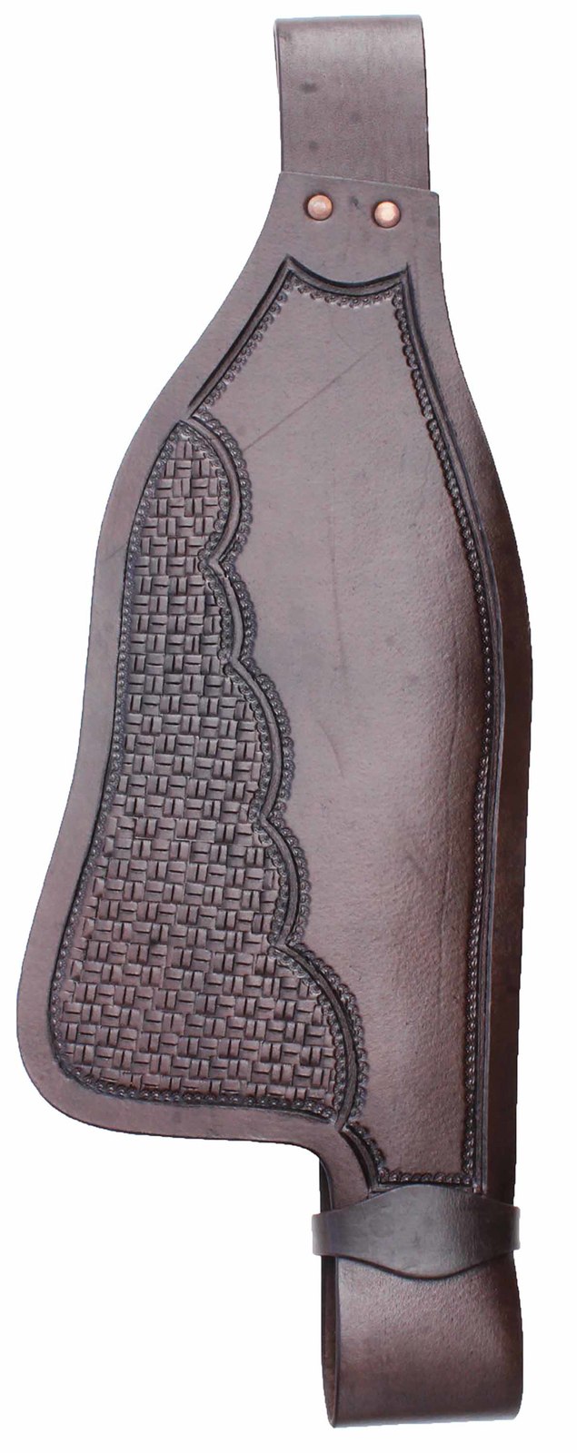 Challenger western saddle replacement fenders made from genuine full grain dark brown leather. Fenders come accented with a hand-tooled basket weave design. These adjustable adult size fenders come complete with belvins buckles and hobble straps. Available in a various leather tones to match your saddle!