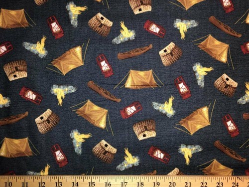Cotton Outdoor Adventure Lakeside Cabin Tent Forest Fabric Print by Yard D480.66