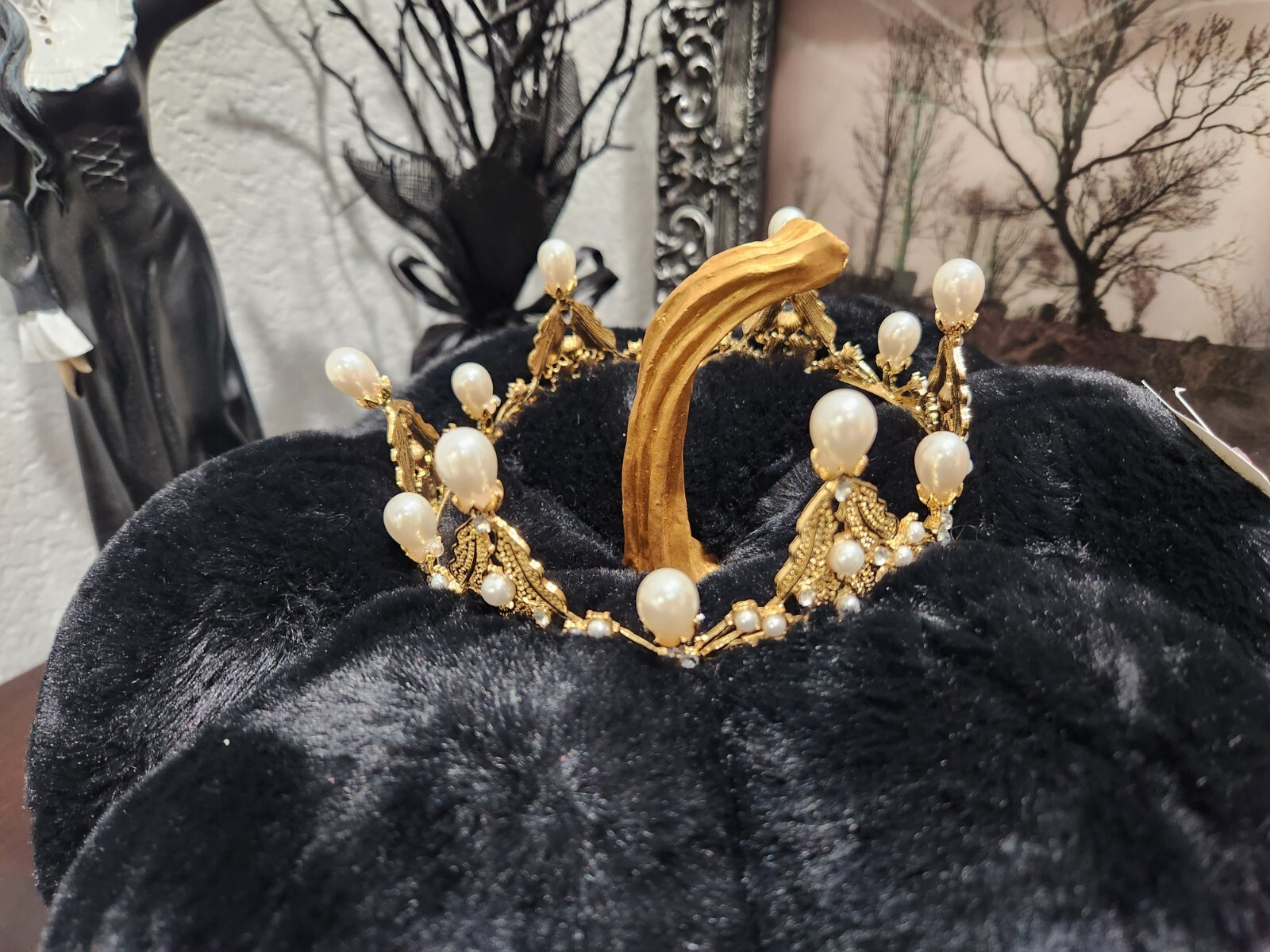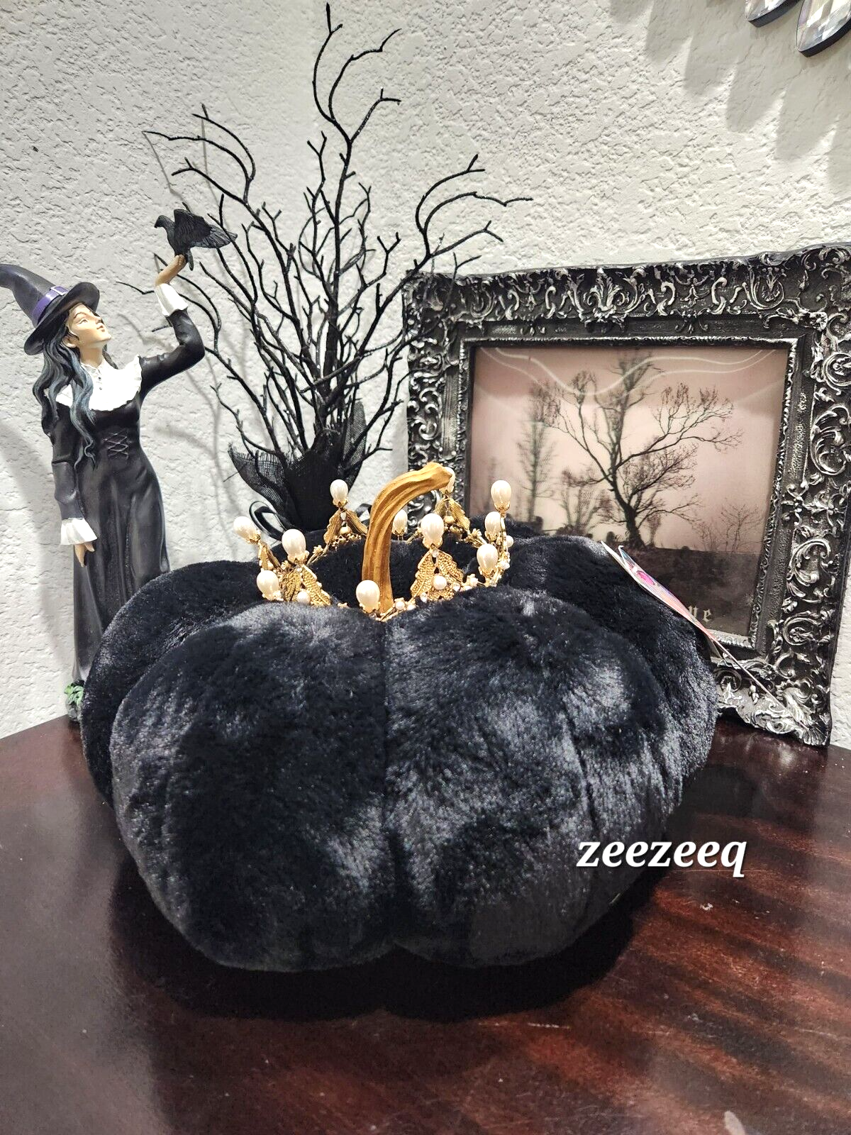 Up for sale we have this Gorgeous faux fur black plush pumpkin with a gold crown. The crown has pearls and the pumpkin has a gold stem. It measures approx 12" accross x 7" tall.