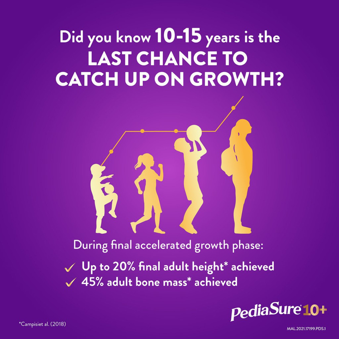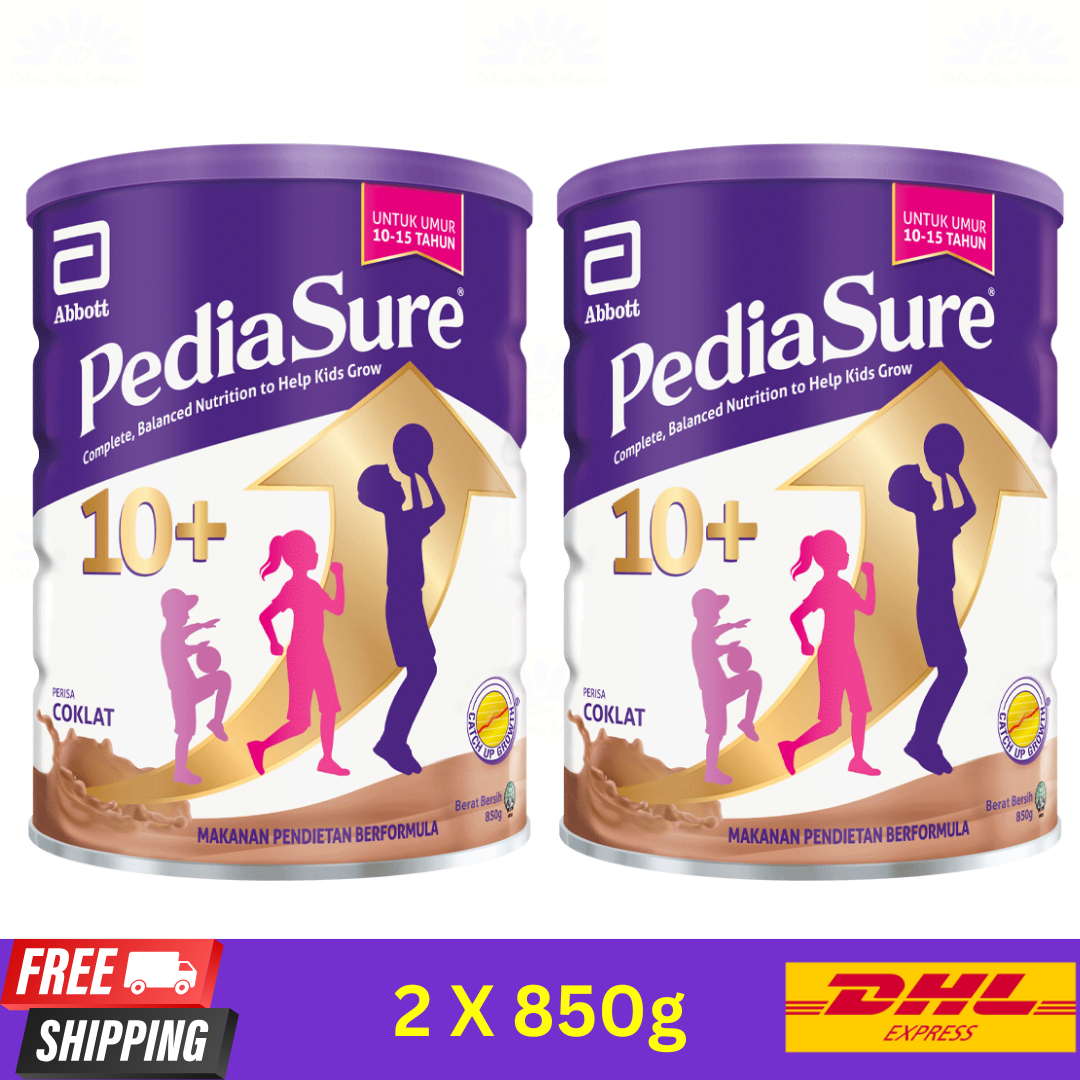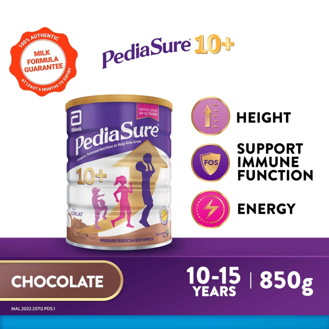 Give your teen the nutritional boost they need with Abbott PediaSure 10+ Chocolate (850 g)?a complete, balanced formula tailored for ages 10?15. Designed to fuel their final growth spurt, this convenient 2-pack ensures your teen receives continuous, quality nutrition during a vital development stage. Supports Last Growth Spurt: Formulated with the unique Triple Growth System?includes double the calcium and natural vitamin K?, 1.6 vitamin D, and high-quality proteins (soy, whey casein) to help maximize growth potential. Complete, Balanced Nutrition: Delivers 34 key nutrients?vitamins, minerals, and essential amino acids?to support physical growth, energy, and immune resilience. Gut Immune Support: Includes prebiotic fiber (FOS) to nourish beneficial gut bacteria, plus zinc, vitamin A,