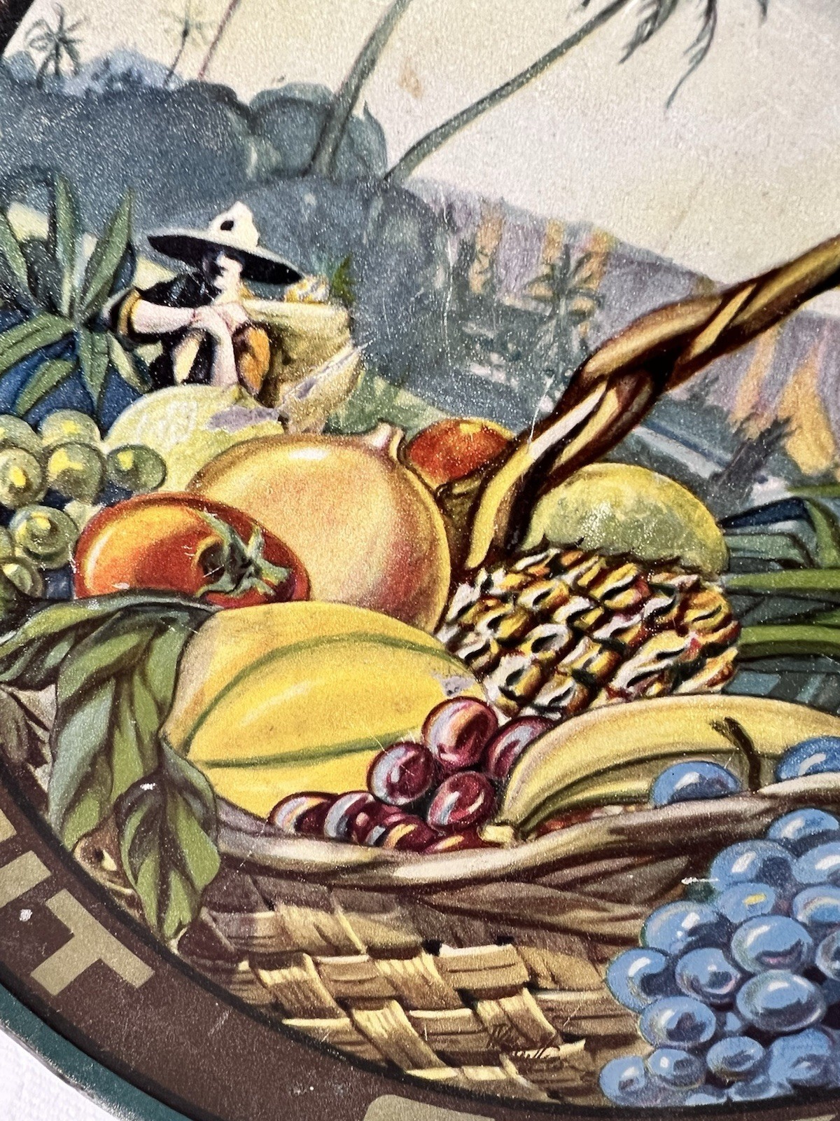 Advertising Memorabilia RARE 1927 Love's Fruit Cake Tin Honolulu Hawaii 10 3/8? wide 3 1/8 Tall a bit of paint loss / discoloring see photos and a small dent on rim
