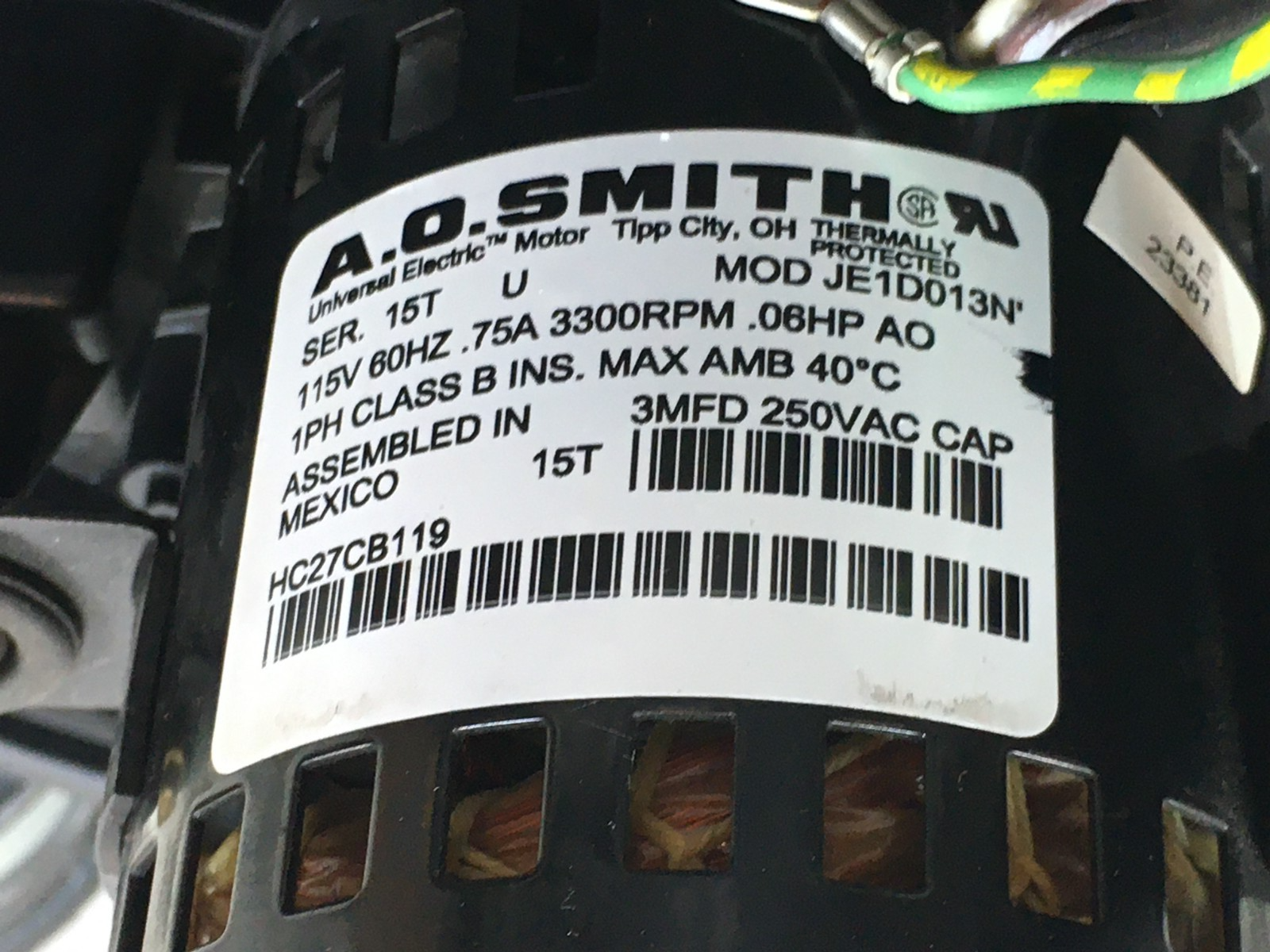 This is A.O. SMITH JE1D013N Carrier Bryant Draft Inducer Blower Motor HC27CB119 115V 3300 RPM .06HP used part, plug is missing.