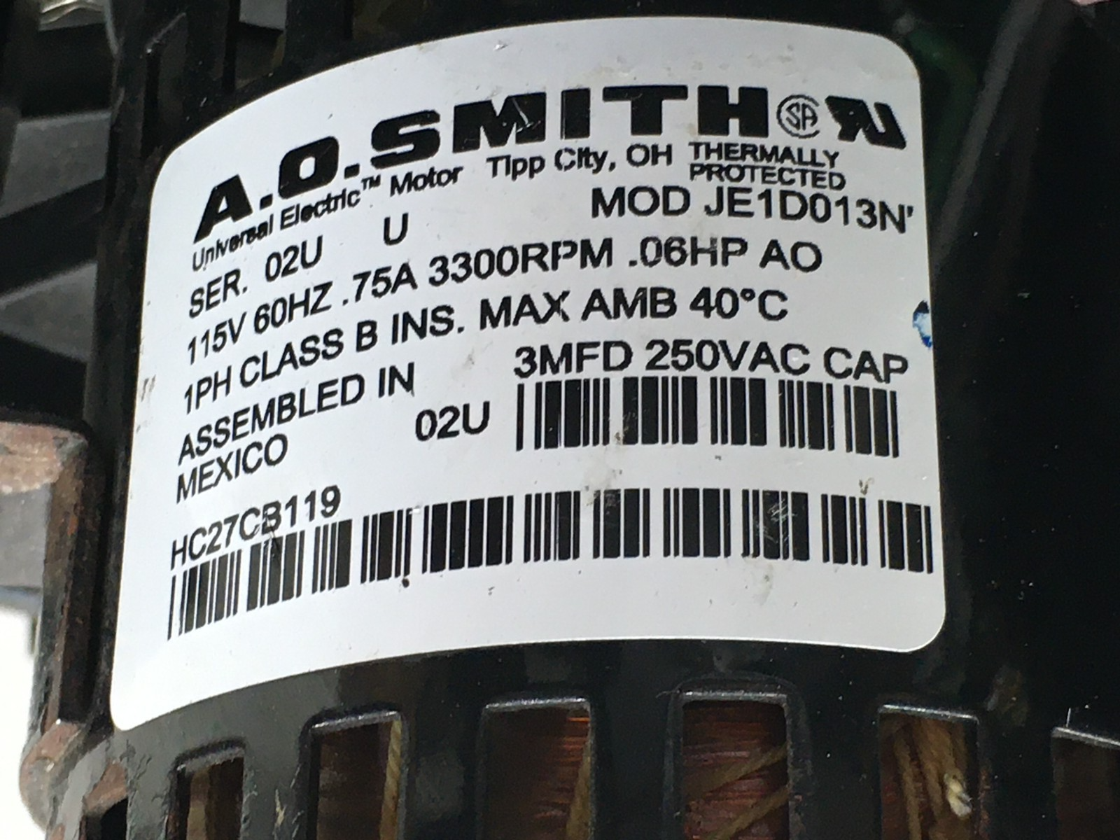 This is A.O. SMITH JE1D013N Carrier Bryant Draft Inducer Blower Motor HC27CB119 115V 3300 RPM .06HP used part.